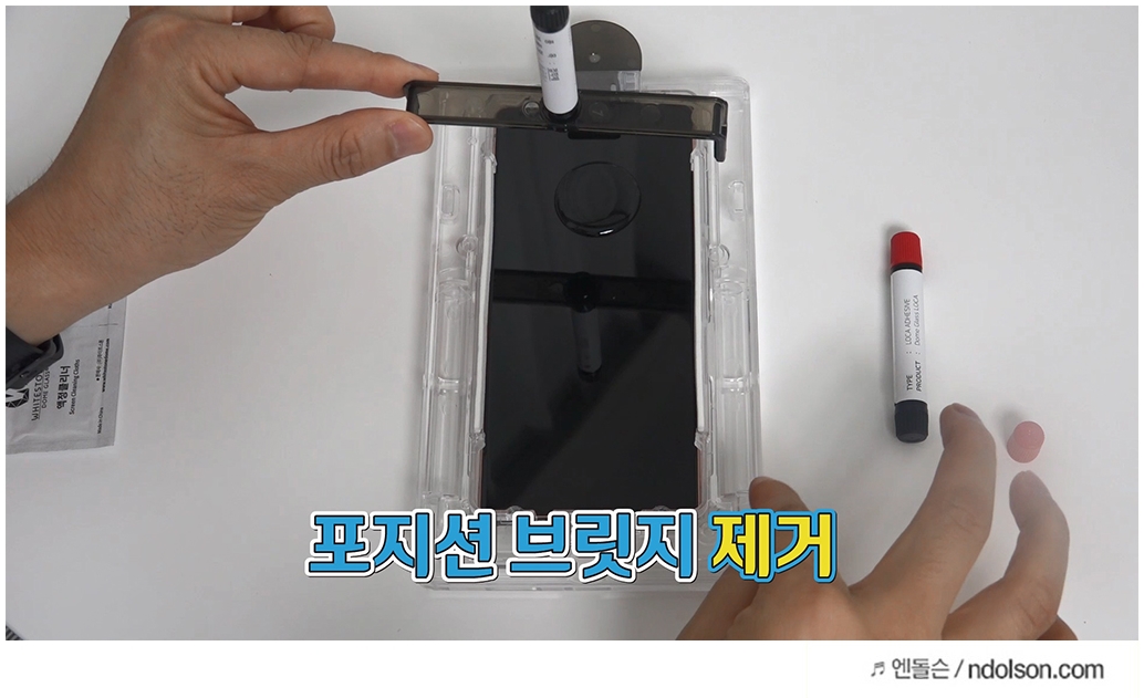 포지션 브릿지에 점착액을 끼우고 뚜껑을 열어 점착액을 빼내줍니다. 그리고 포지션 브릿지를 제거합니다.