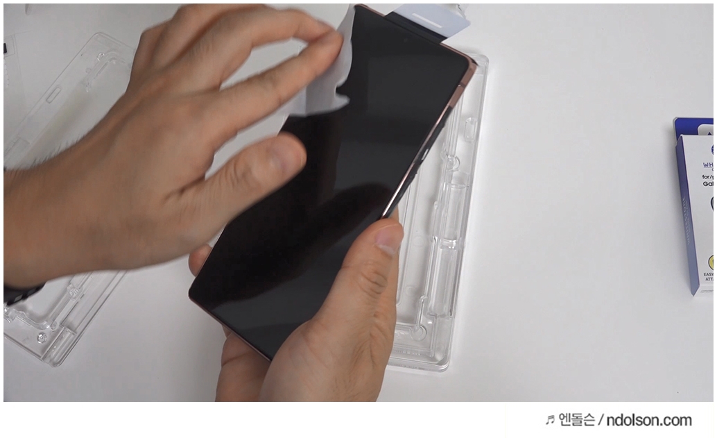 노트20을 틀에서 꺼내서 액정 클리너로 닦아 줍니다.