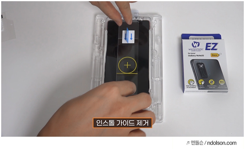 점착액이 강화유리와 노트20 디스플레이 사이를 모두 퍼져나갑니다. 이제 인스톨 가이드를 제거합니다. 손잡이를 잡고 빼주면 됩니다.