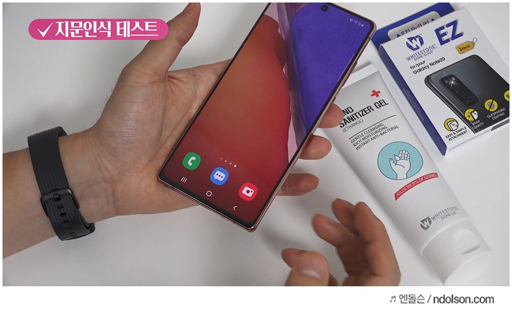 지문인식 테스트를 해보았는 데 잘 동작하네요. 하지만 노트20 강화유리를 부착 후, 지문인식률을 높이기 위해서는 기존 지문을 제거하고 다시 등록해줍니다. 또 동일 손가락이라도 여러개의 지문을 등록하면 보다 인식률을 높일 수 있습니다. 또 터치 민감도를 켜두면 빠르게 동작하기도 합니다.