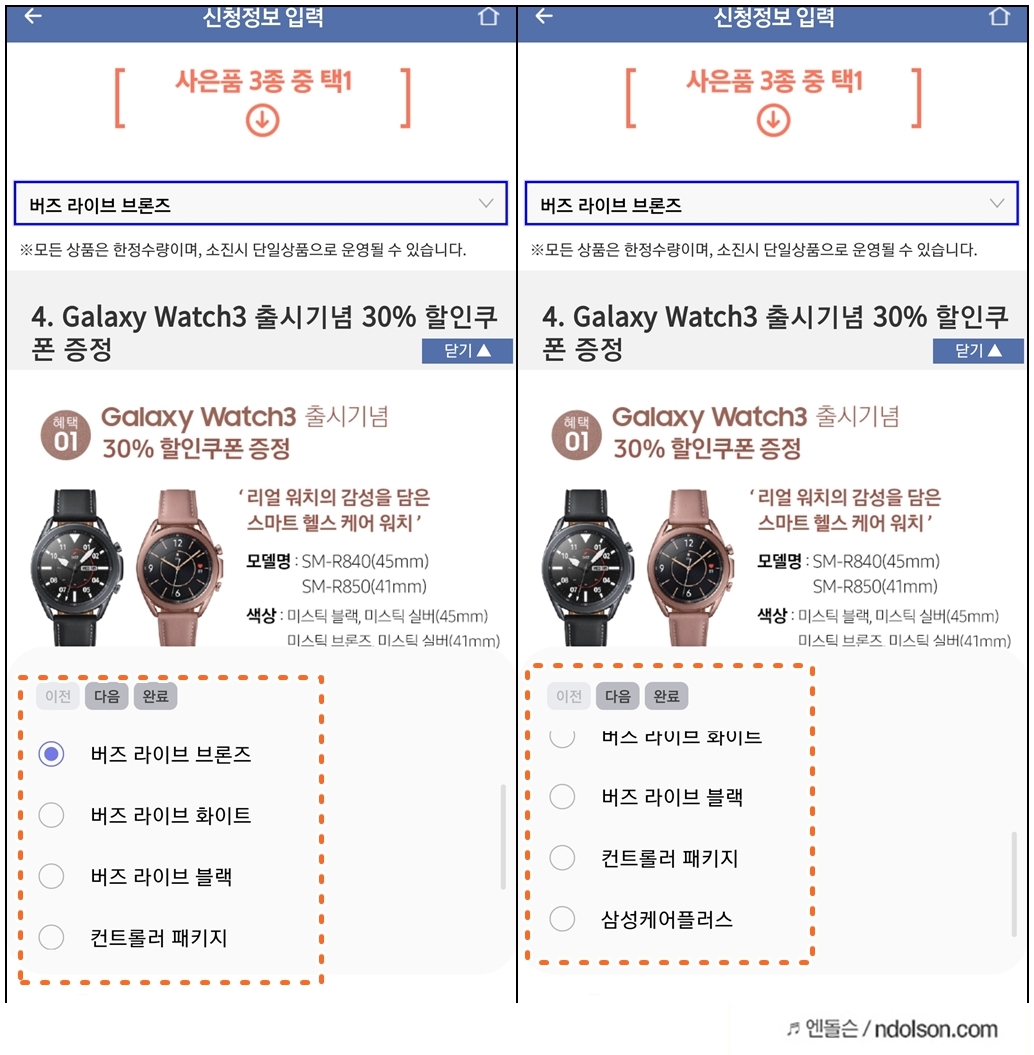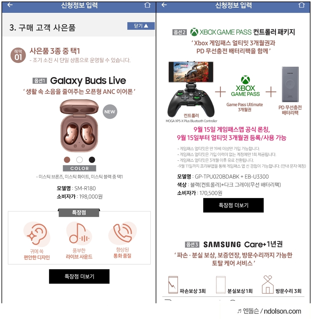 지금은 버즈 라이브 브론즈 색상과 블랙/화이트 색상이 선택이 가능합니다. 그외 XBOX 컨트롤러 패키지와 삼성케어 플러스를 선택할 수 있습니다.
