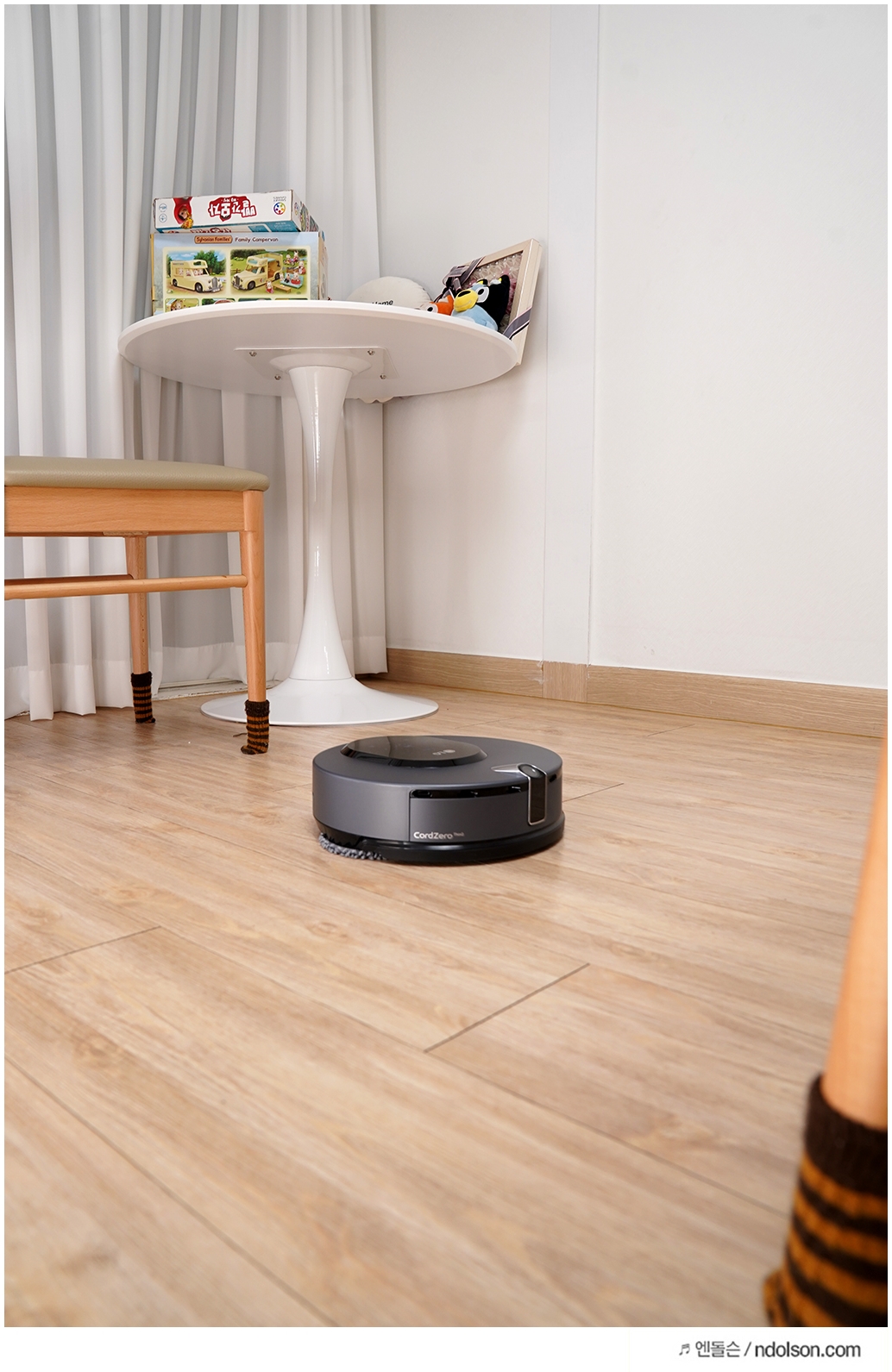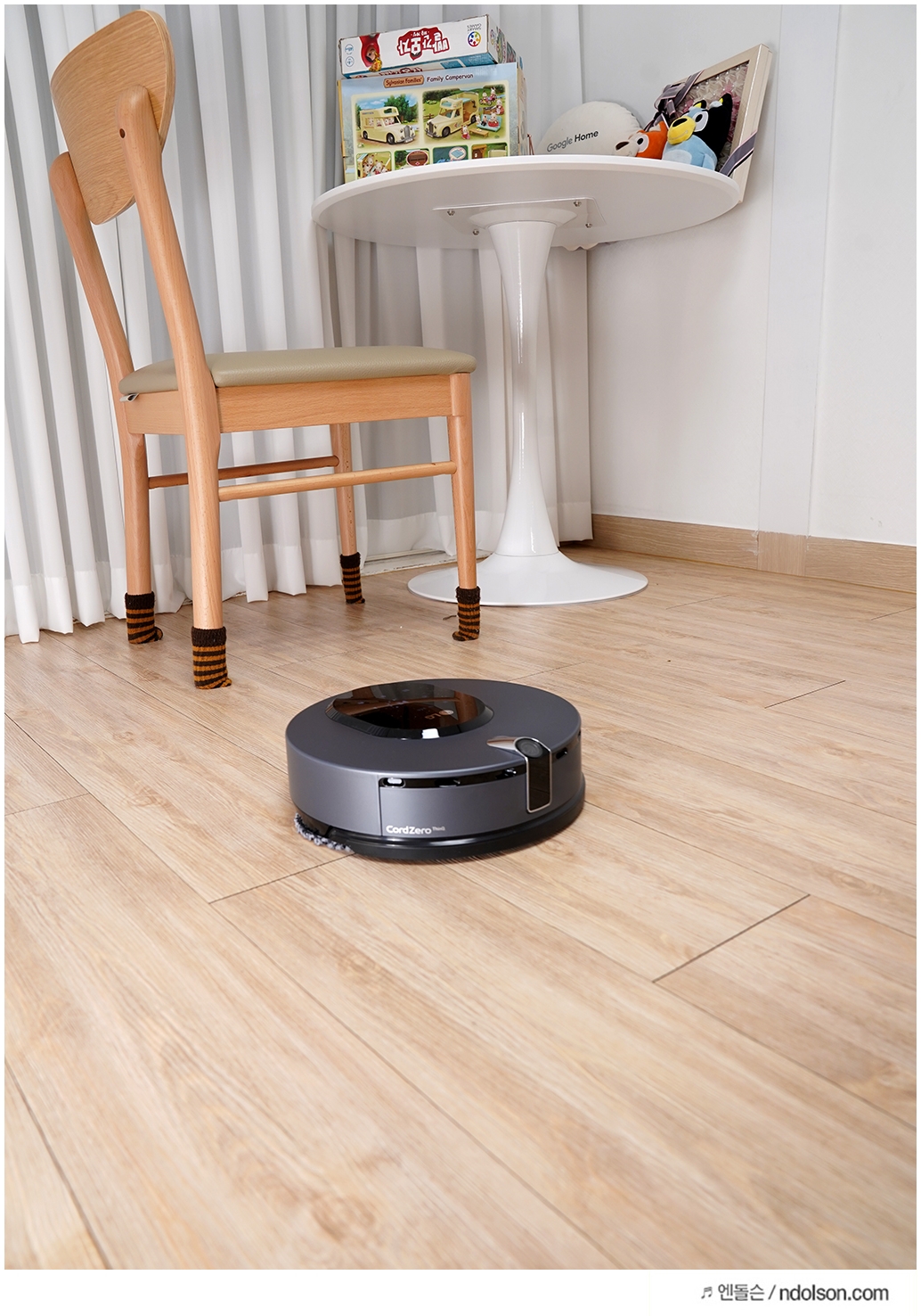 장애물 감지 센서(ToF 레이저 센서, 범퍼 센서 등)이 있어서 벽이나 장애물에 부딪히지 않고 정말 조용히 청소를 잘합니다. 우리 딸 공부방 책상 밑이나 식탁 밑의 공간도 꼼꼼히 먼지를 닦아주니 좋습니다.