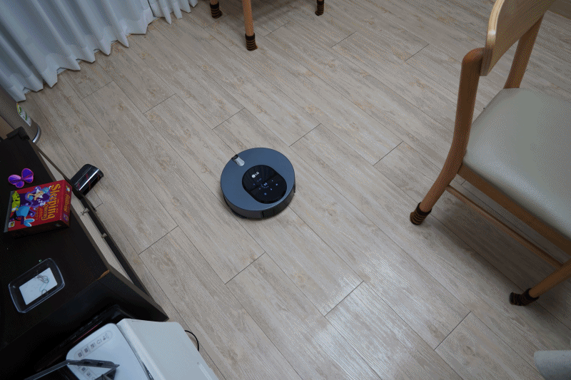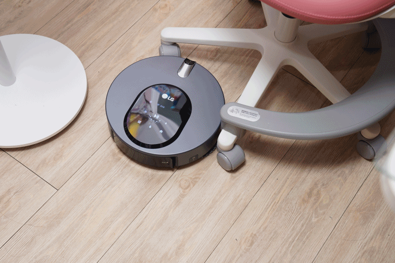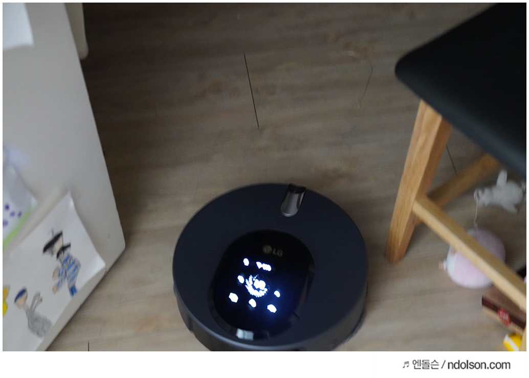 재미있는 실험을 해보았는데요. 야간에 불을 끄고 청소를 시켜 보았습니다. 그런데 벽에 부딪히지 않고 청소를 잘하는 게 신기했는데요. LG 코드제로 M9 로봇청소기의 하부 거리센서(마우스와 동일 센서)가 있어서 부딪히지 않는다고 하네요.