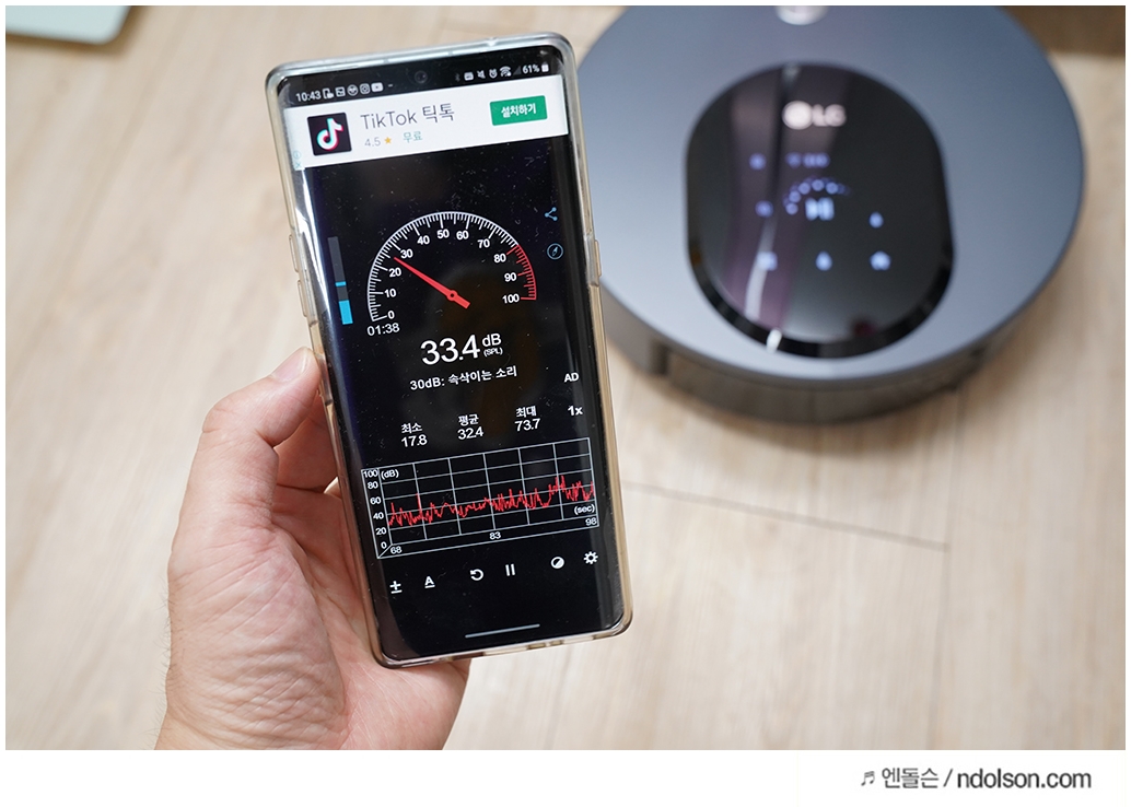 그러면 소음은 얼마나 발생할까? 바로 앞에서 측정해보았는 데, 33.4dB의 속삭이는 소리가 발생하였습니다. 꼼꼼/퀵 모드에서는 36db 정도이며, 일반적으로 44dB 정도 발생하였습니다. 그래서 밤에 딸아이 재우고 청소기를 돌렸지만, 전혀 시끄럽다는 생각이 들지 않을 정도네요.