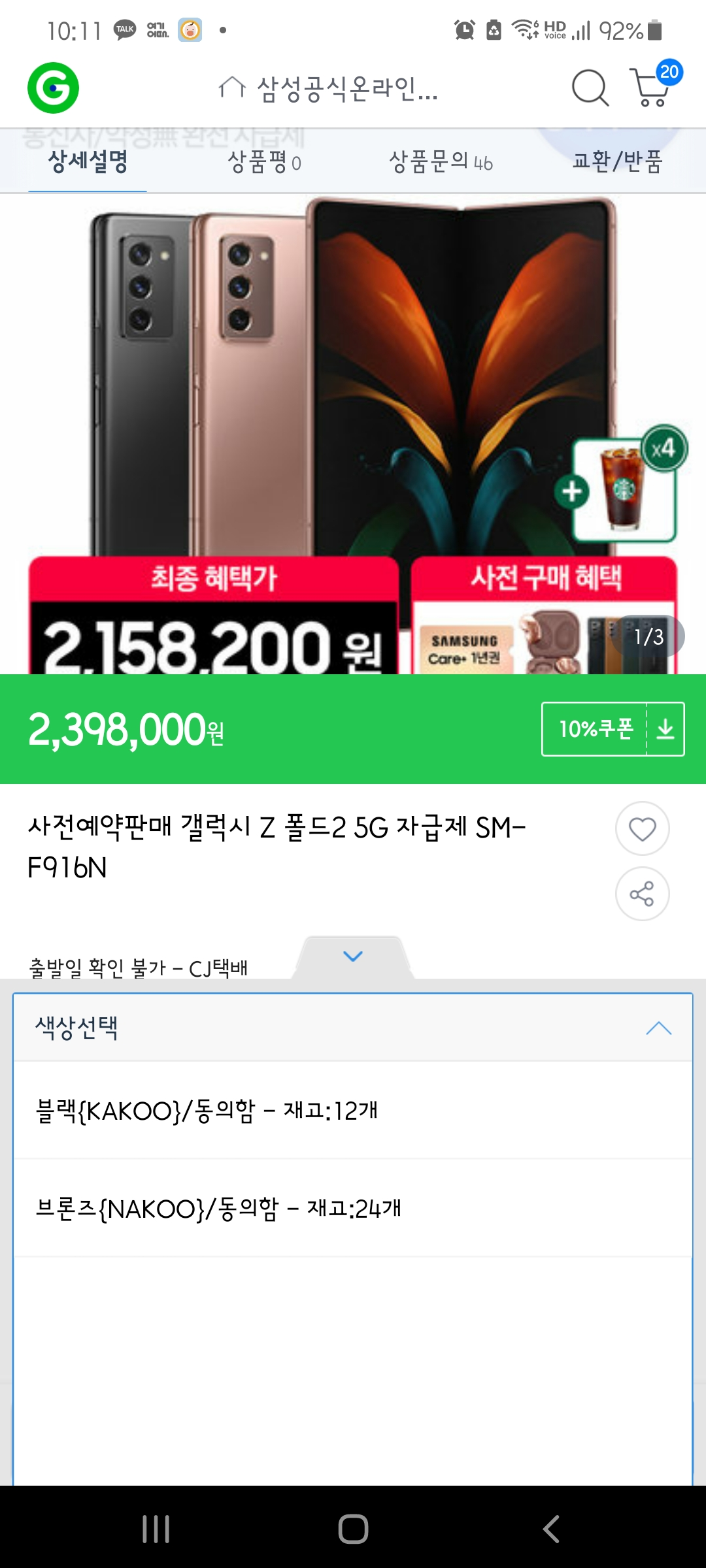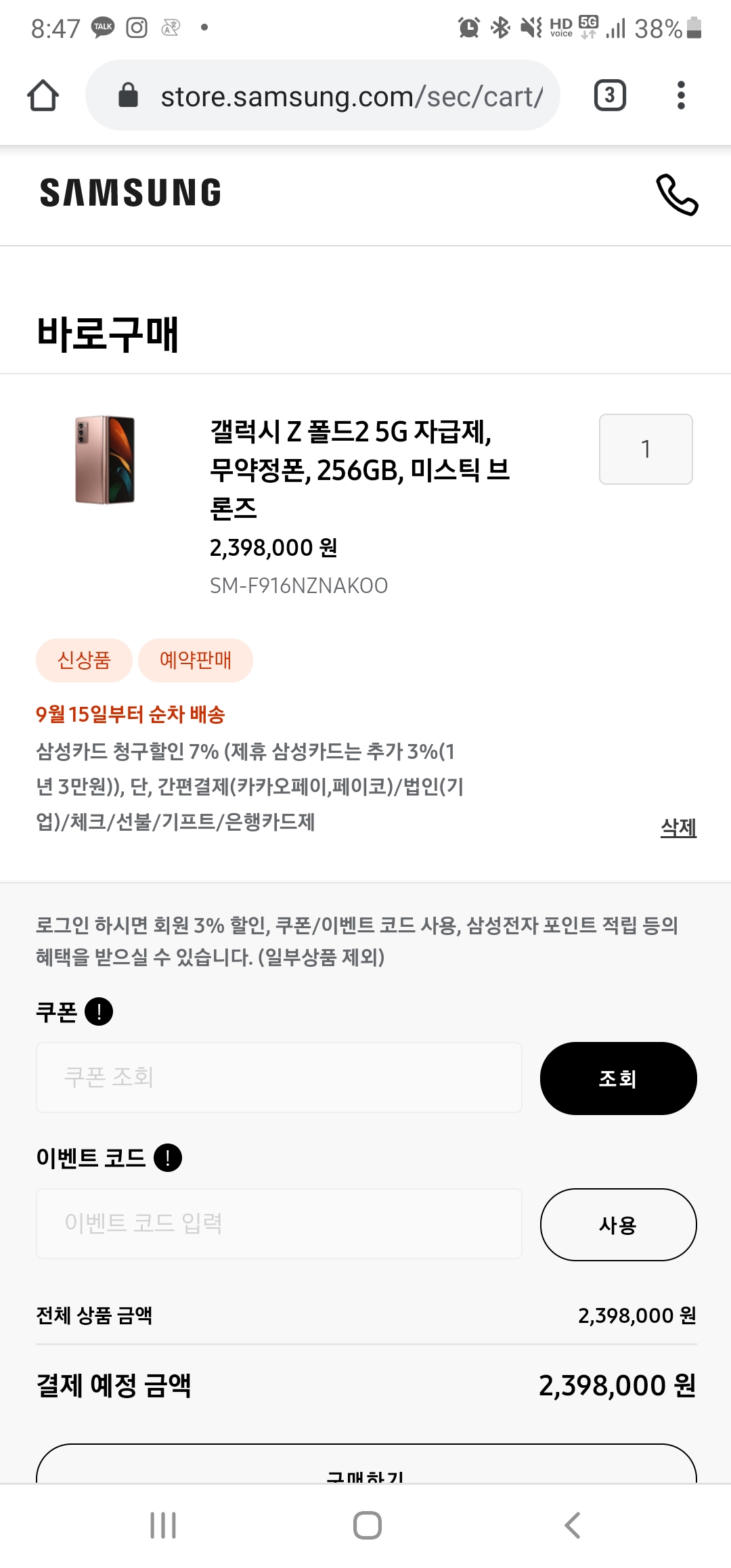 결국 갤럭시Z 폴드2 는 11번가에서 구매하였습니다. 신용카드를 내가 원하는 걸 쓸 수 있고, 혜택이 있어서 결국 구매는 했습니다.