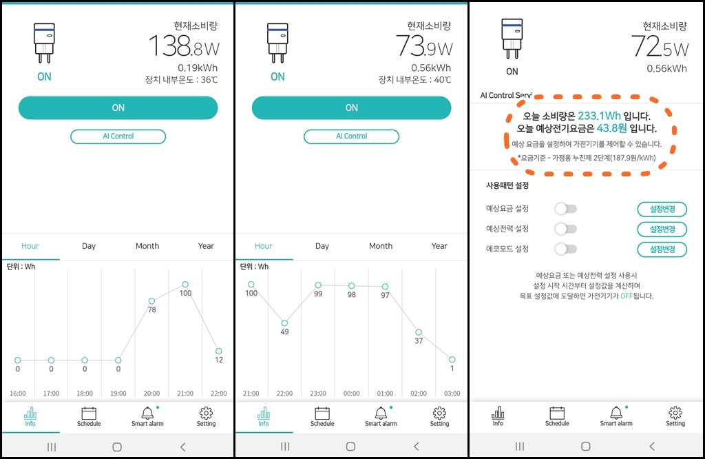 19시부터 켜서 새벽 3시까지 켜 두었는데요. 소비전력이 궁금해서 전력 측정기로 확인해 보았습니다. 138.9W를 사용하다가 그래프가 점점 올라가다 설정한 온도에 도달하면 그래프는 유지되거나 감소합니다. 하루에 사용한 전력은 43.8원으로 예상되었는데요. 소비전력이 월등히 낮습니다.