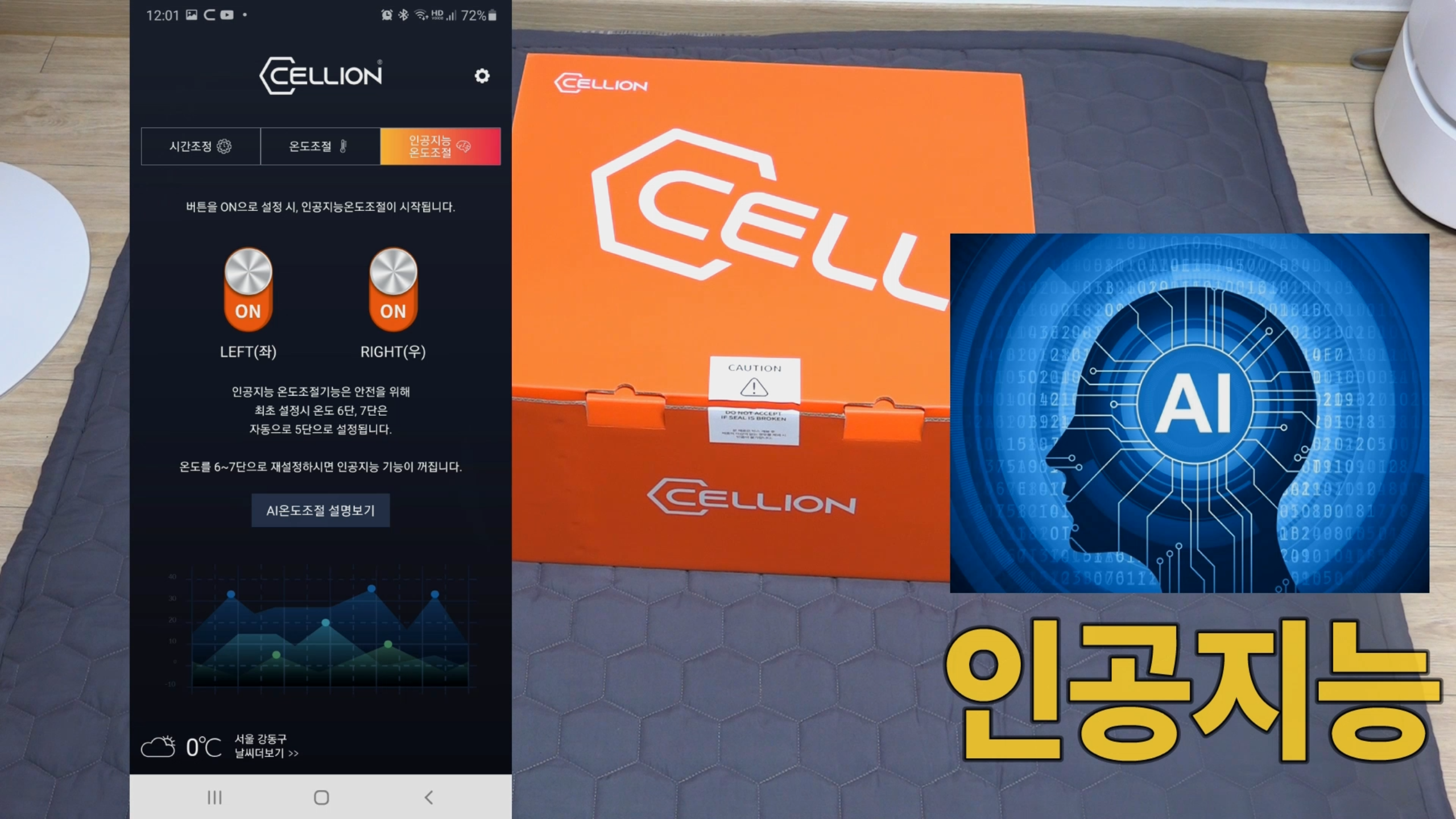 여기에 업그레이드 된 고급 기능으로 세계 최초로 온열매트에 인공지능 기능을 넣어 날씨에 따라 스스로 온도를 조절하는 스마트함을 가진 제품인데요. 직접 사용하면서 느낀 가장 진보된 셀리온 인공지능 DC 온열매트를 사용해보았습니다.
