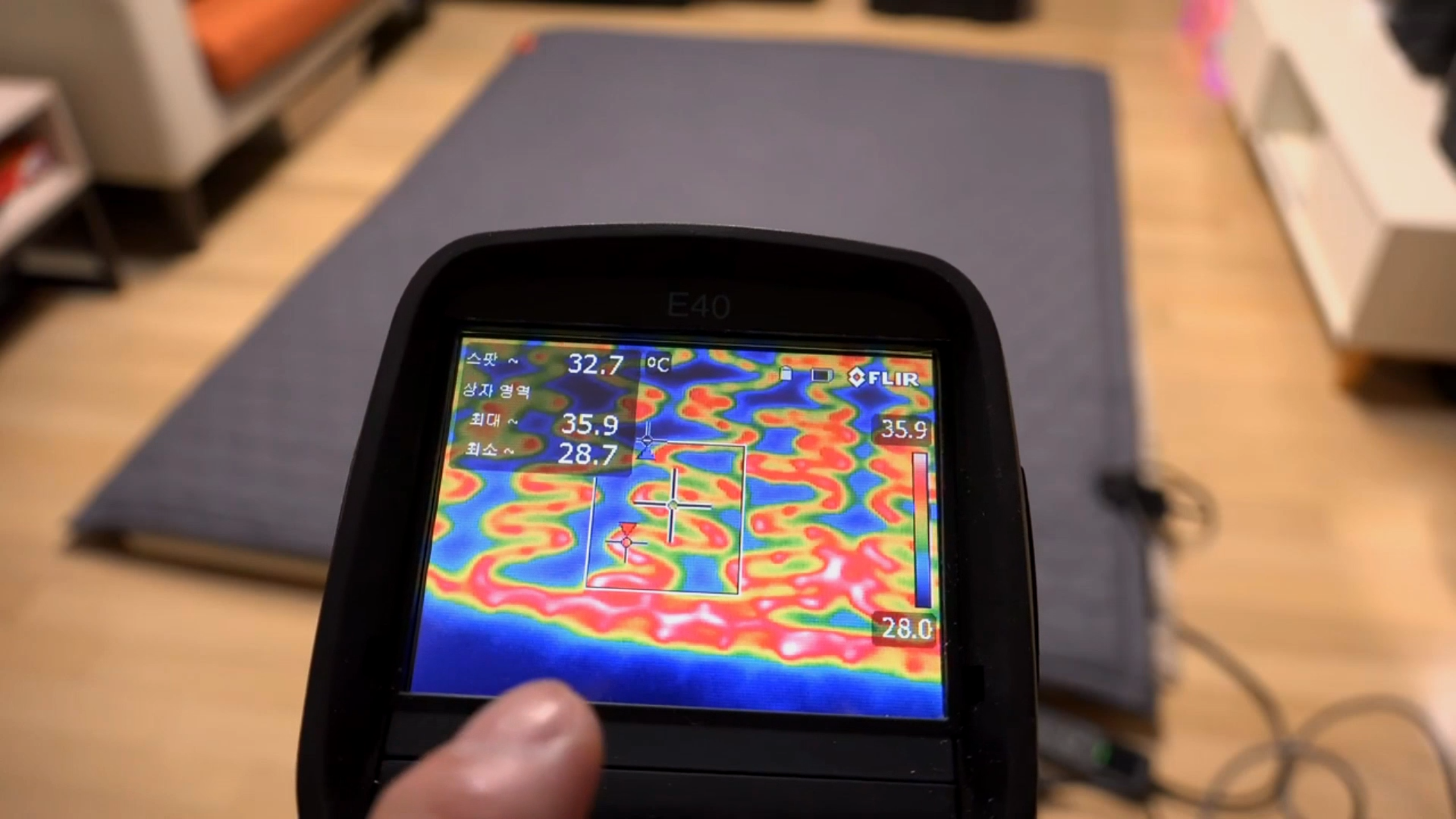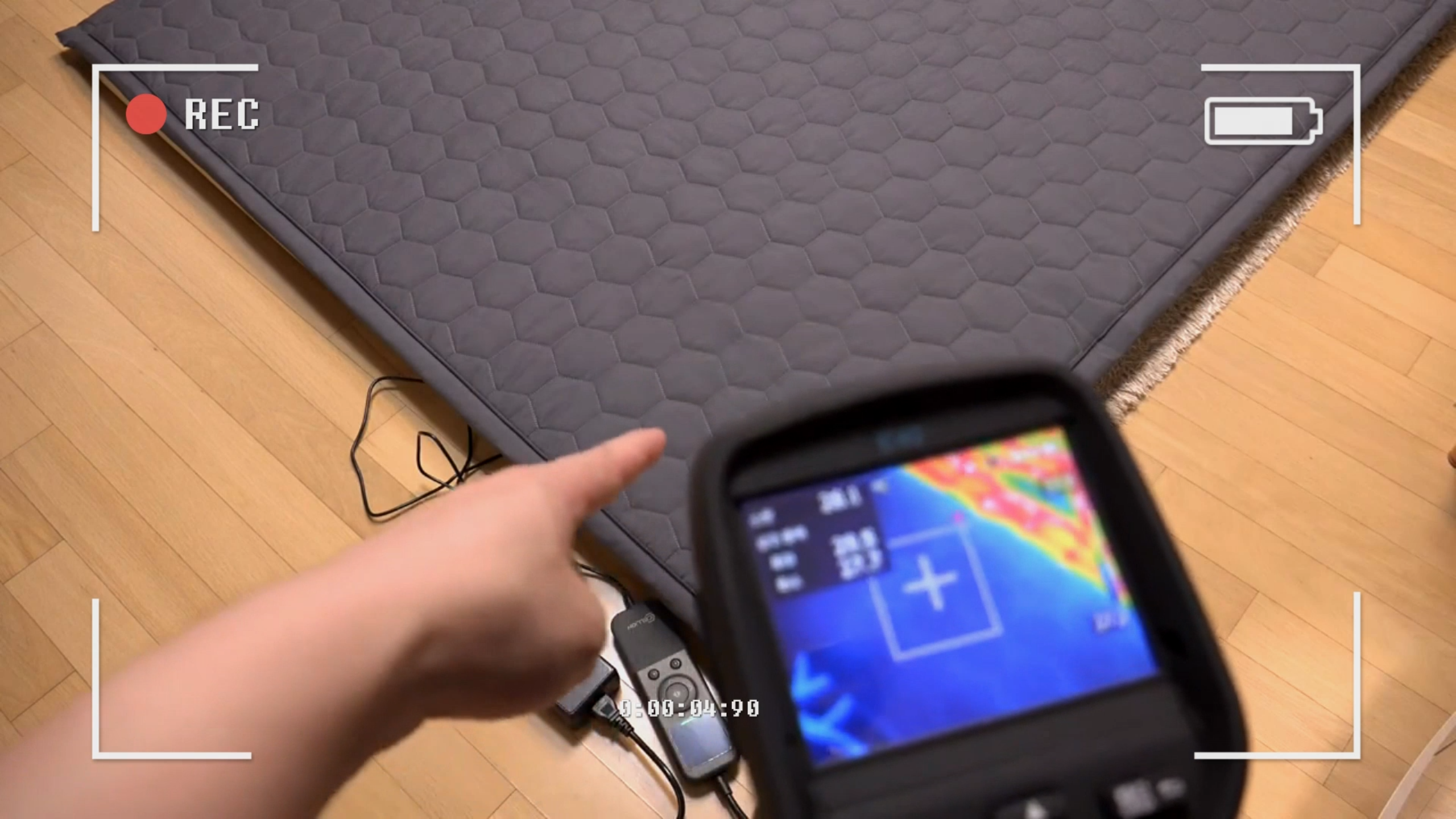 열화상 카메라로 보면 열선이 어떻게 생겼는 지 볼 수 있는데요. 촘촘하게 열선이 되어 있고 양면으로 뒤집어서도 사용할 수 있습니다. 그런데 신기하게도 머리가 닿는 상단 부분에는 열선이 없습니다. 머리는 시원하게 몸은 따뜻하게 사용할 수 있게 설계되었네요.