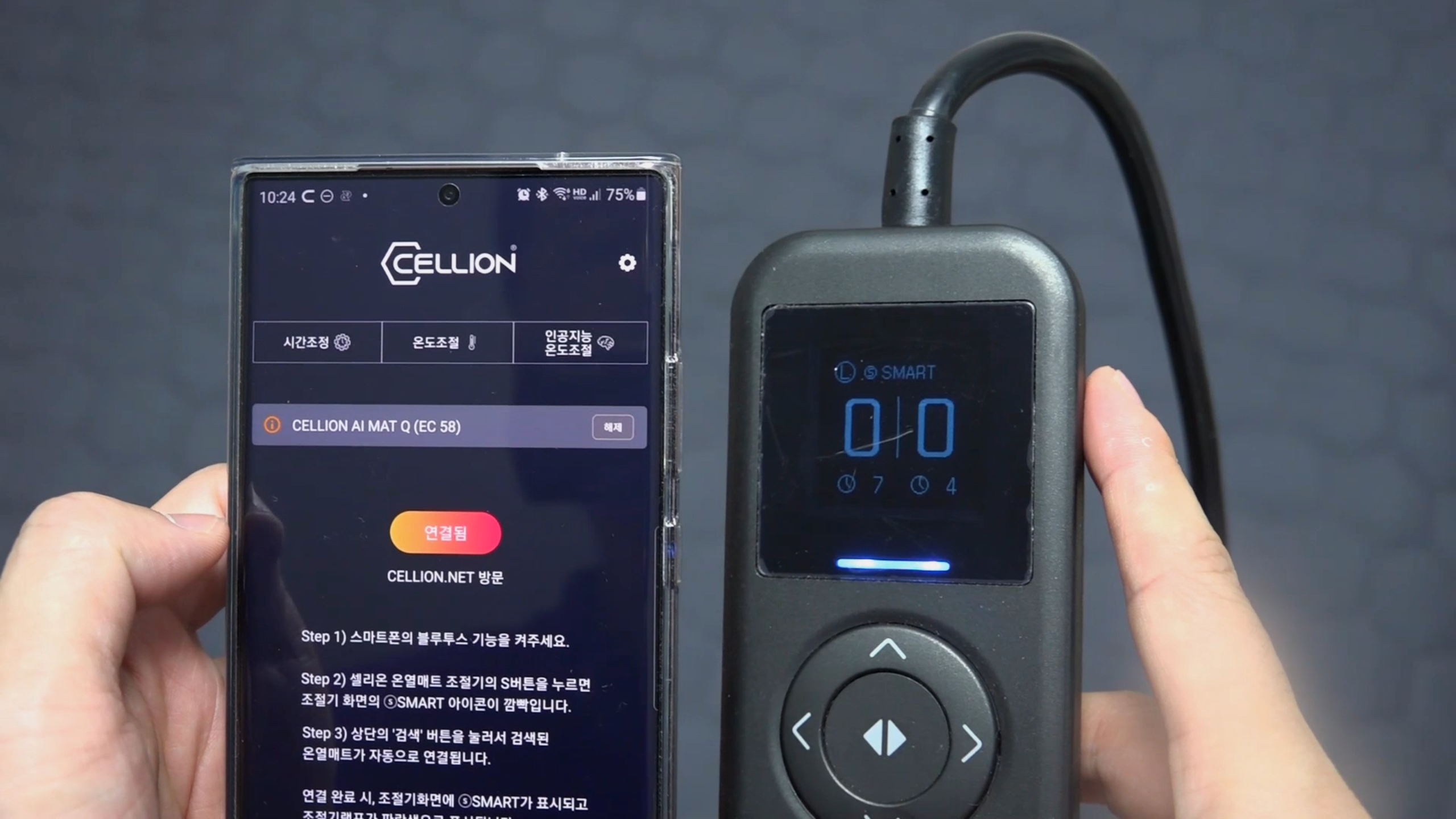 셀리온 컨트롤러에 있는 S버튼을 누르면 스마트폰과 연동할 수 있습니다.