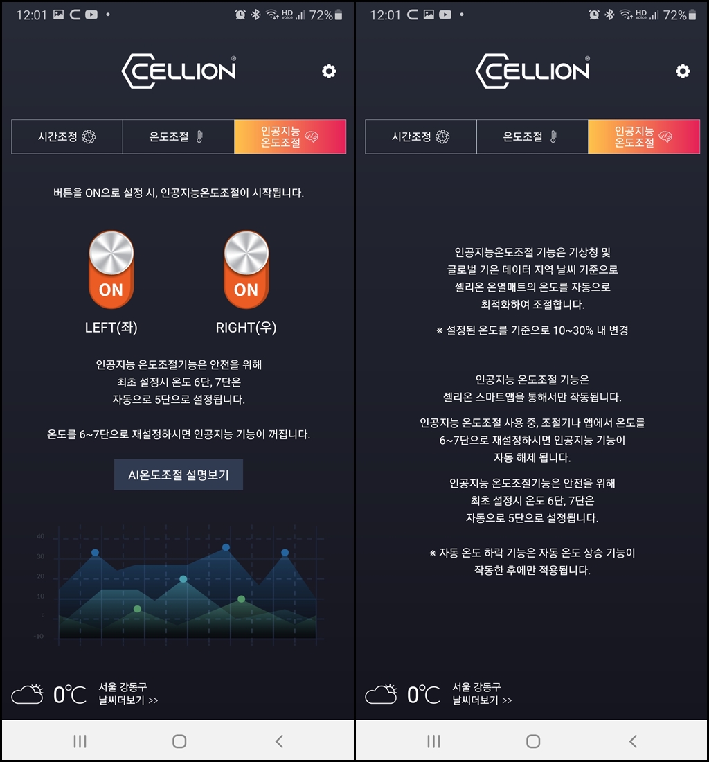 가장 중요하게 바로 인공지능 기능을 ON/OFF 하는 것입니다. 스마트폰 모드에서만 동작하는 인공지능 모드는 갑자기 추워지더라도 알아서 온도를 조절해주는 기능입니다.