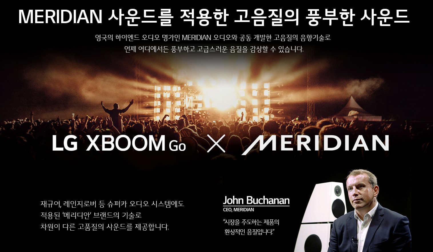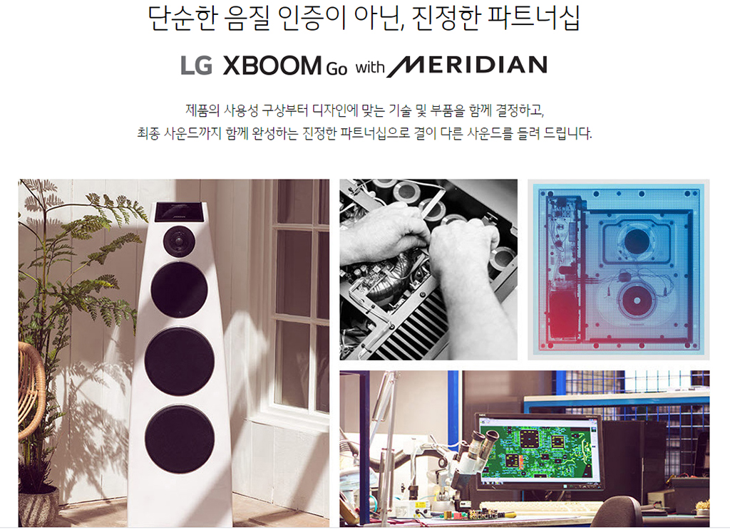 이처럼 LG 엑스붐Go에 적용된 메리디안의 기술을 통해 깊이감 있는 음향을 풍부한 사운드로 들을 수 있습니다.