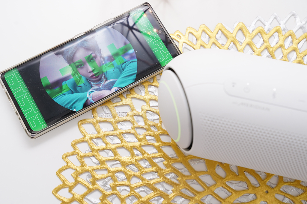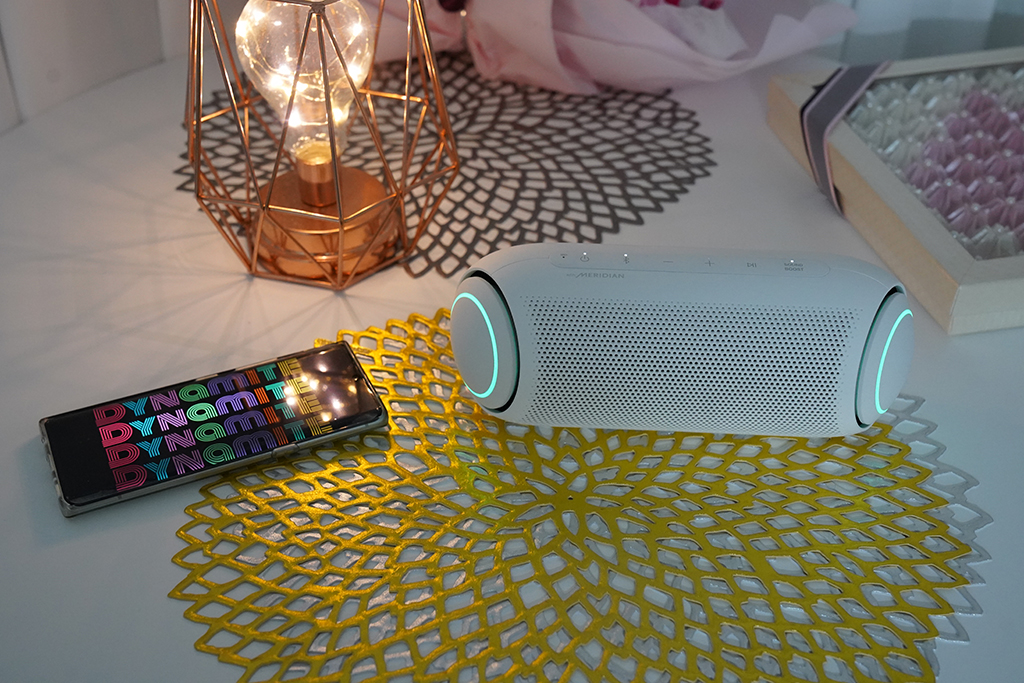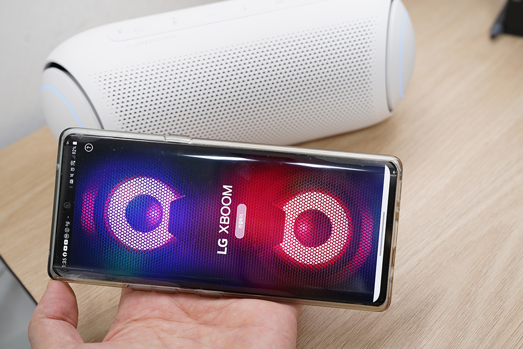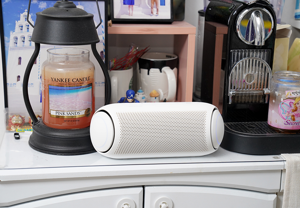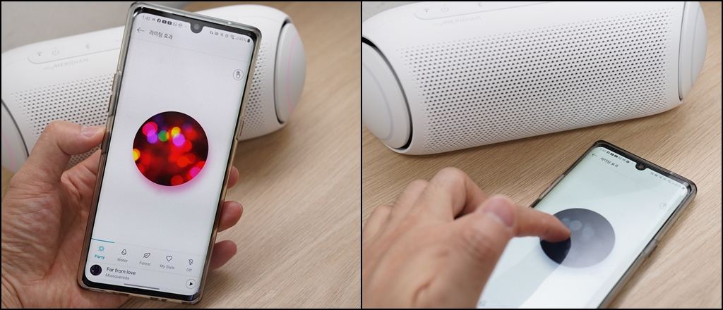 제품을 쓰다 보니 신나는 음악을 더욱 흥겹게 해주는 양쪽 LED 라이팅의 화려함이 정말 마음에 듭니다. 참고로 멀티 컬러 라이팅은 비트에 따라 변하고 LG XBOOM 앱 연동으로 숲 느낌이나 나만의 색을 골라 세팅할 수도 있습니다.