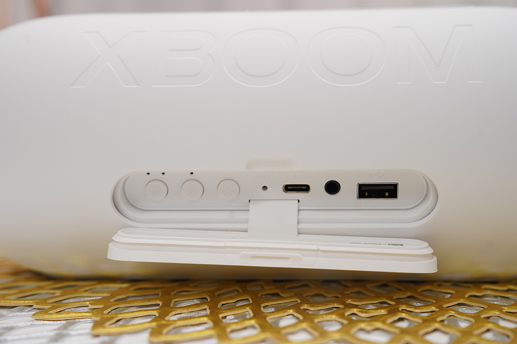 후면에는 XBOOM 의 로고가 음각으로 각인되어 있고, 깔끔한 모양을 볼 수 있습니다. 감추어진 뚜껑을 열어보면 버튼이 보이는데, LG엑스붐Go 를 멀티로 연결할 수 있게 조작하는 기능과 USB-C 단자 충전부, USB 및 Aux 연동 단자로 구성되어 있습니다.