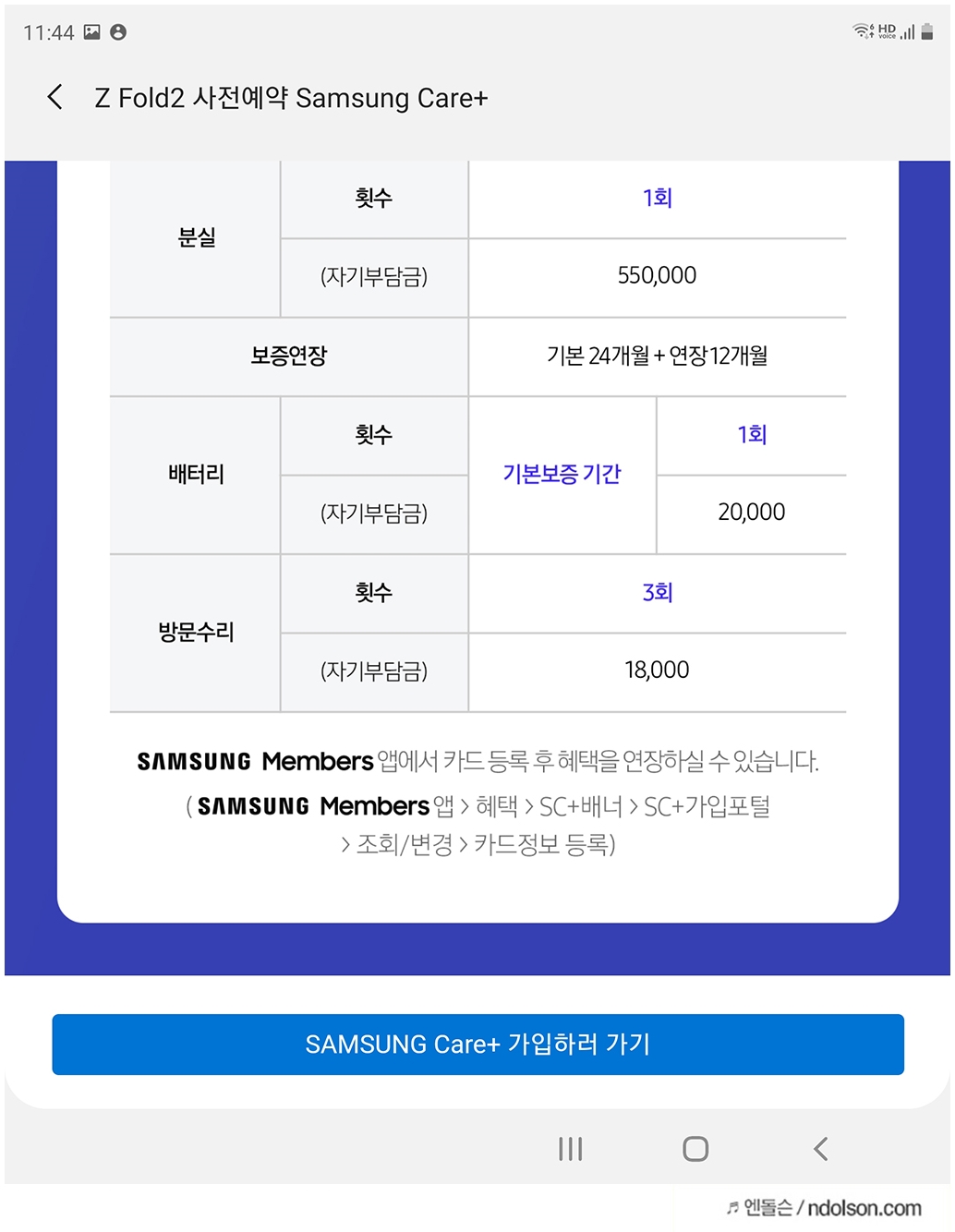 개통 문자가 오면, 이제 삼성 케어 플러스 서비스에 가입하시면 됩니다.
