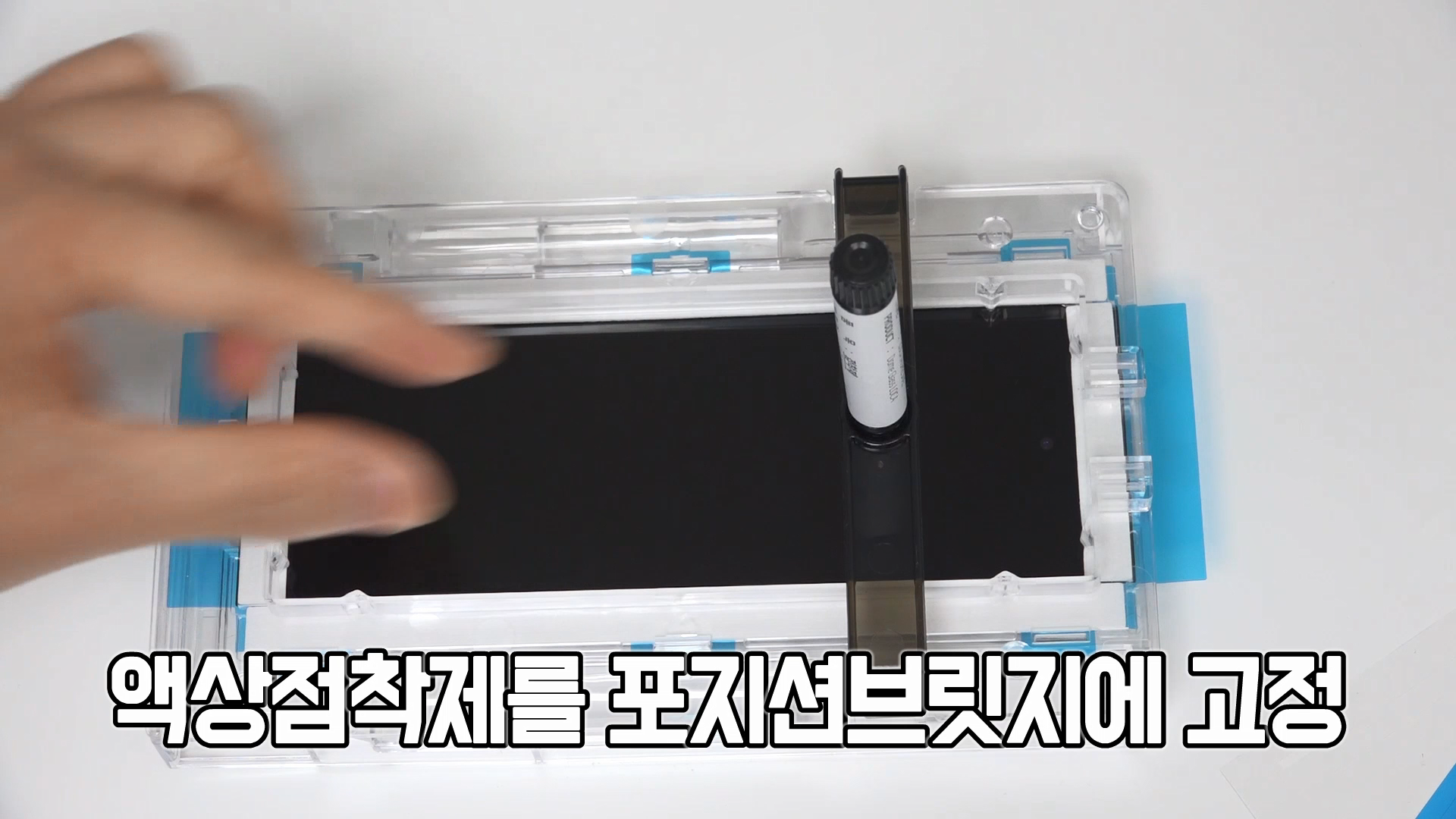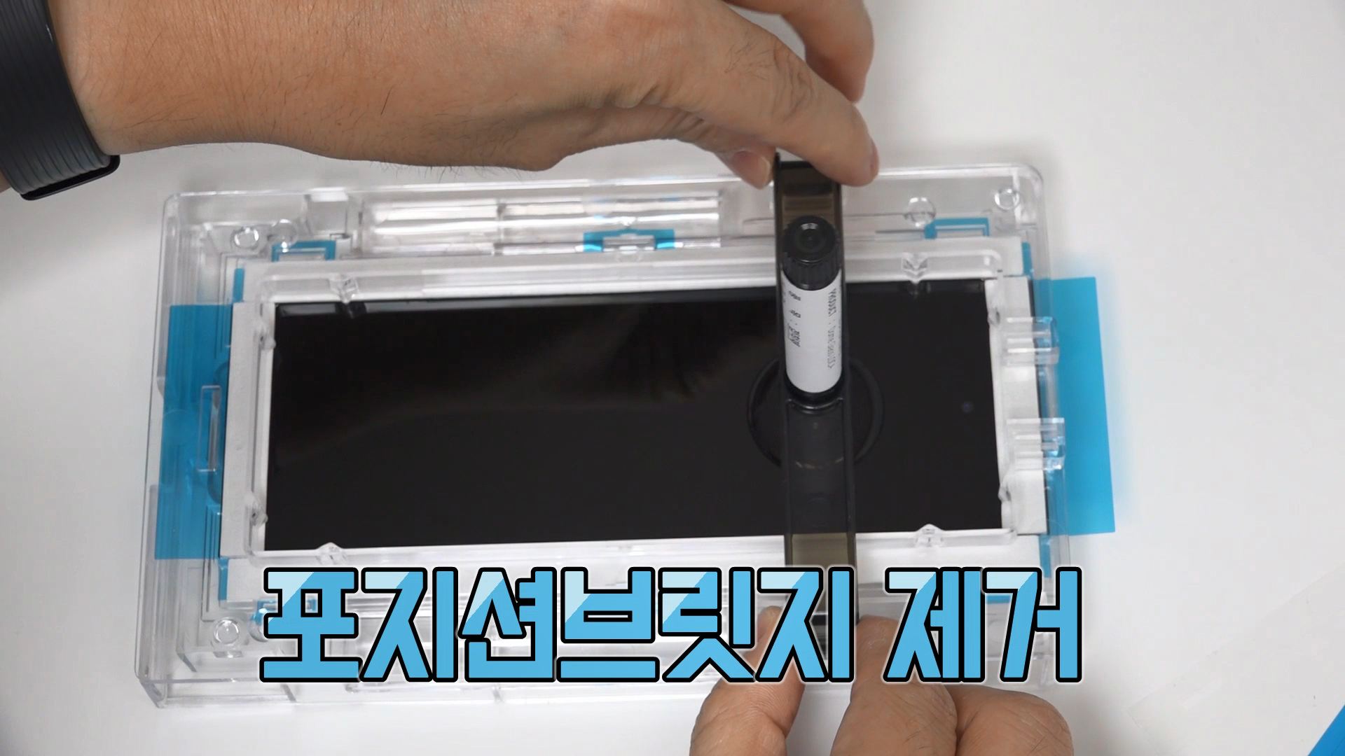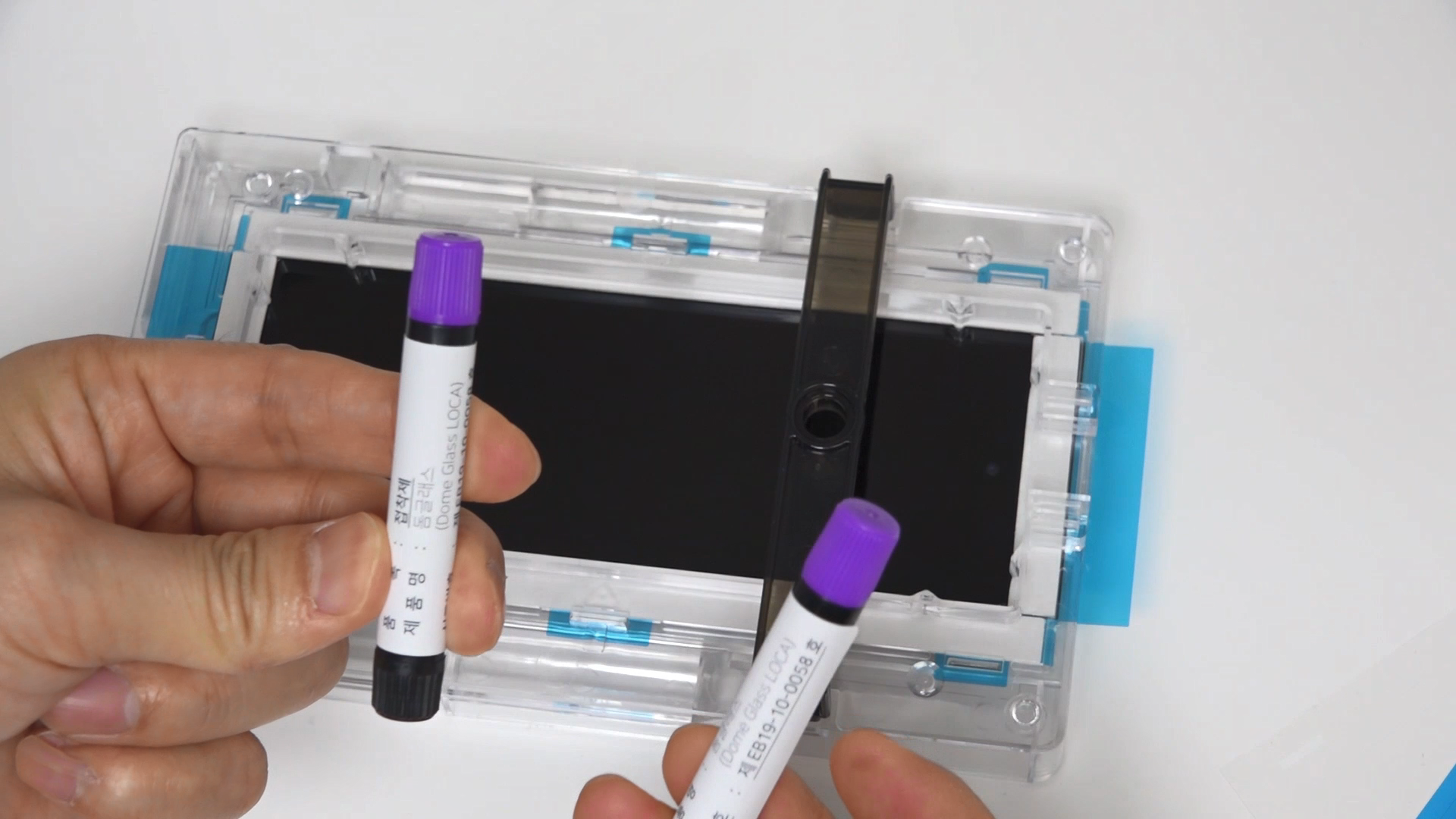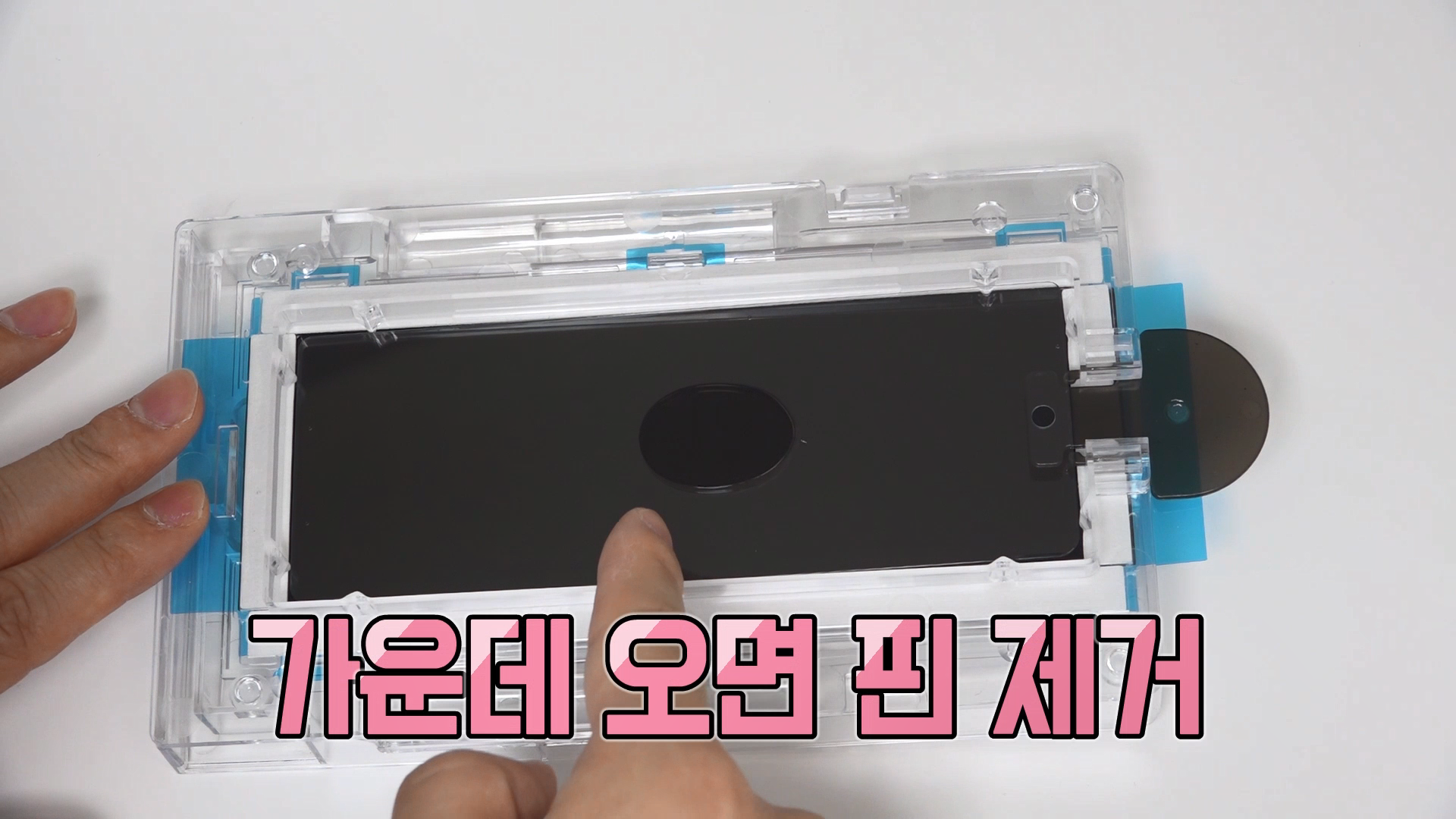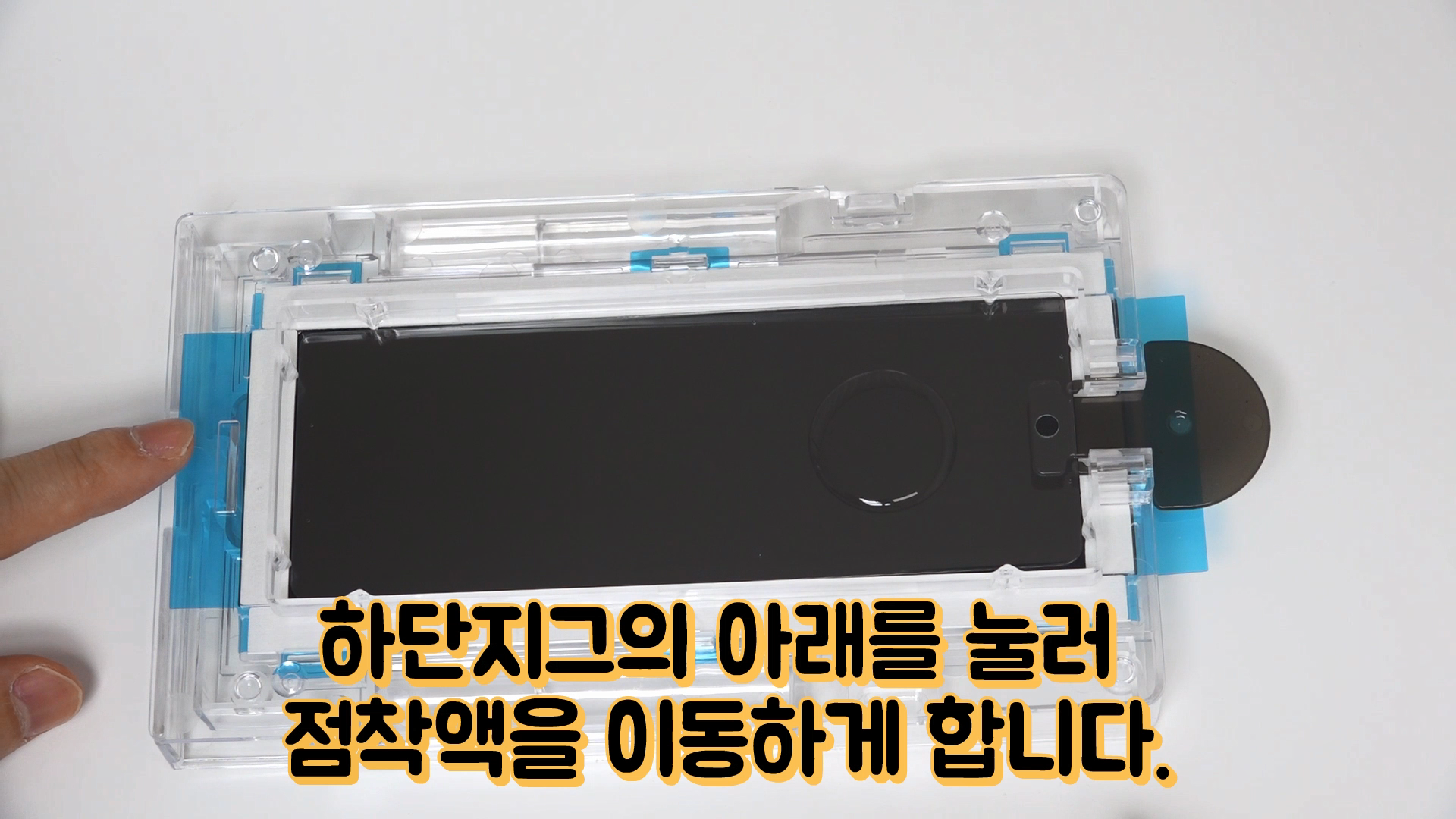 하단 지그의 아래쪽을 누르면 시소처럼 기울여집니다. 점착액이 화면에서 가운데로 미끄러져 내려옵니다. 이때 고정핀을 제거해줍니다.