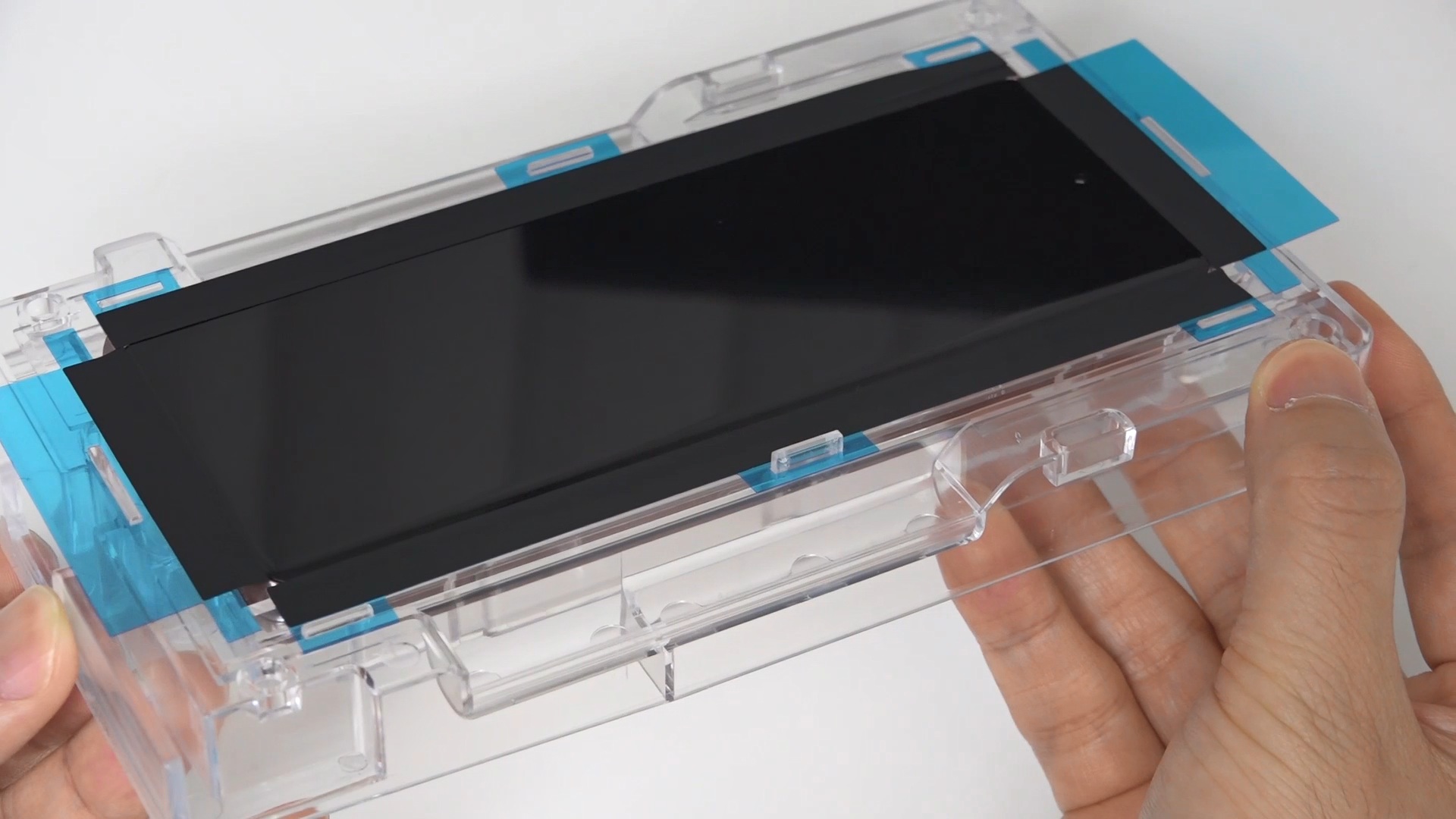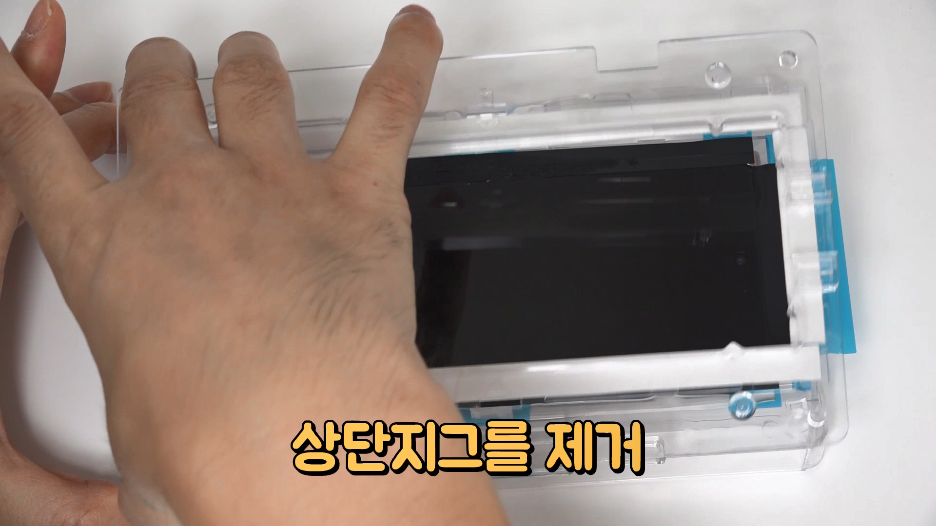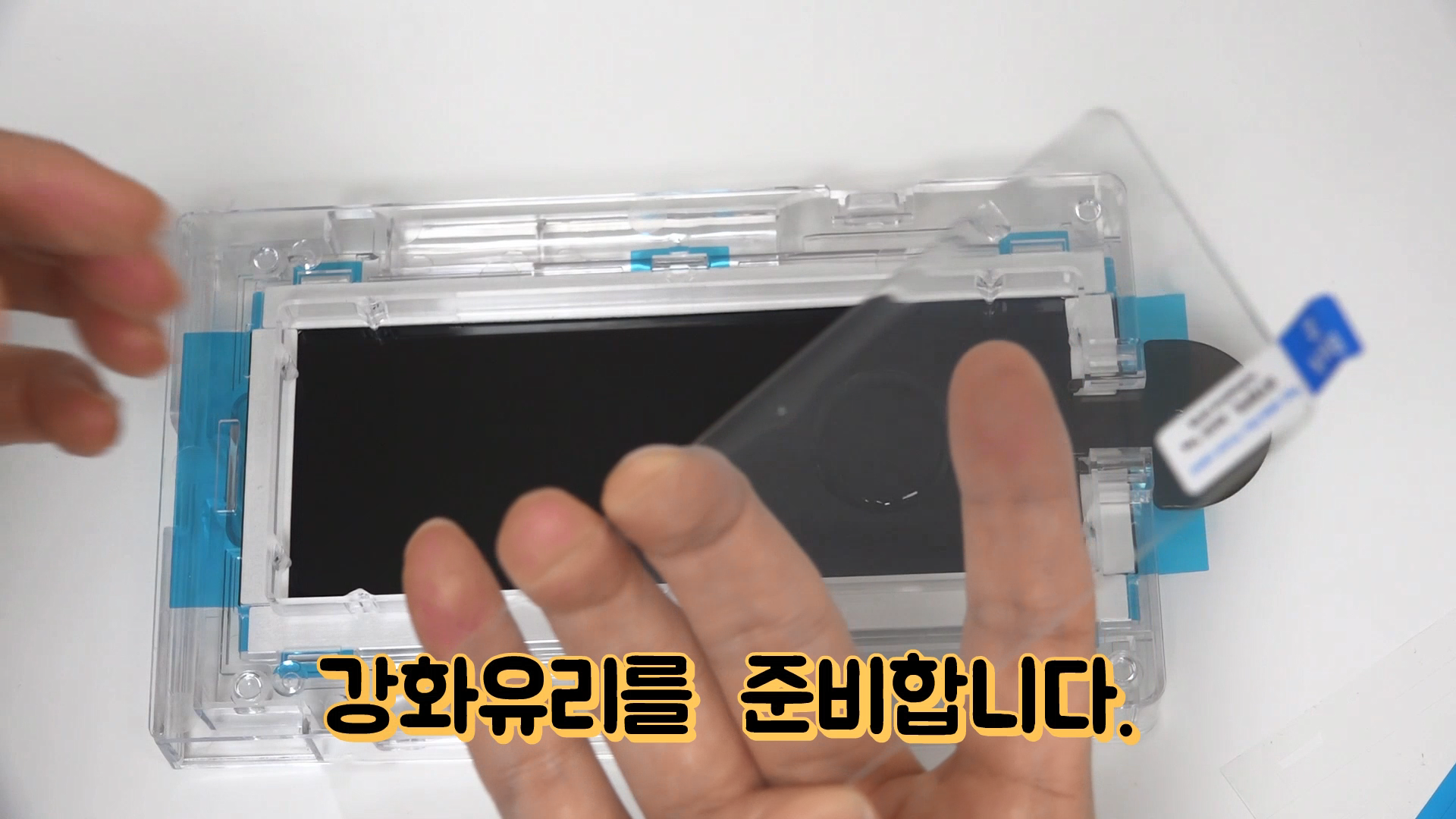 강화유리를 준비합니다. Back라고 쓰여 있는 보호필름을 제거 후, 틀 위에 올려 줍니다. 이렇게 되어도 고정핀이 있어서 바로 점착액과 강화유리가 달라붙지 않습니다.
