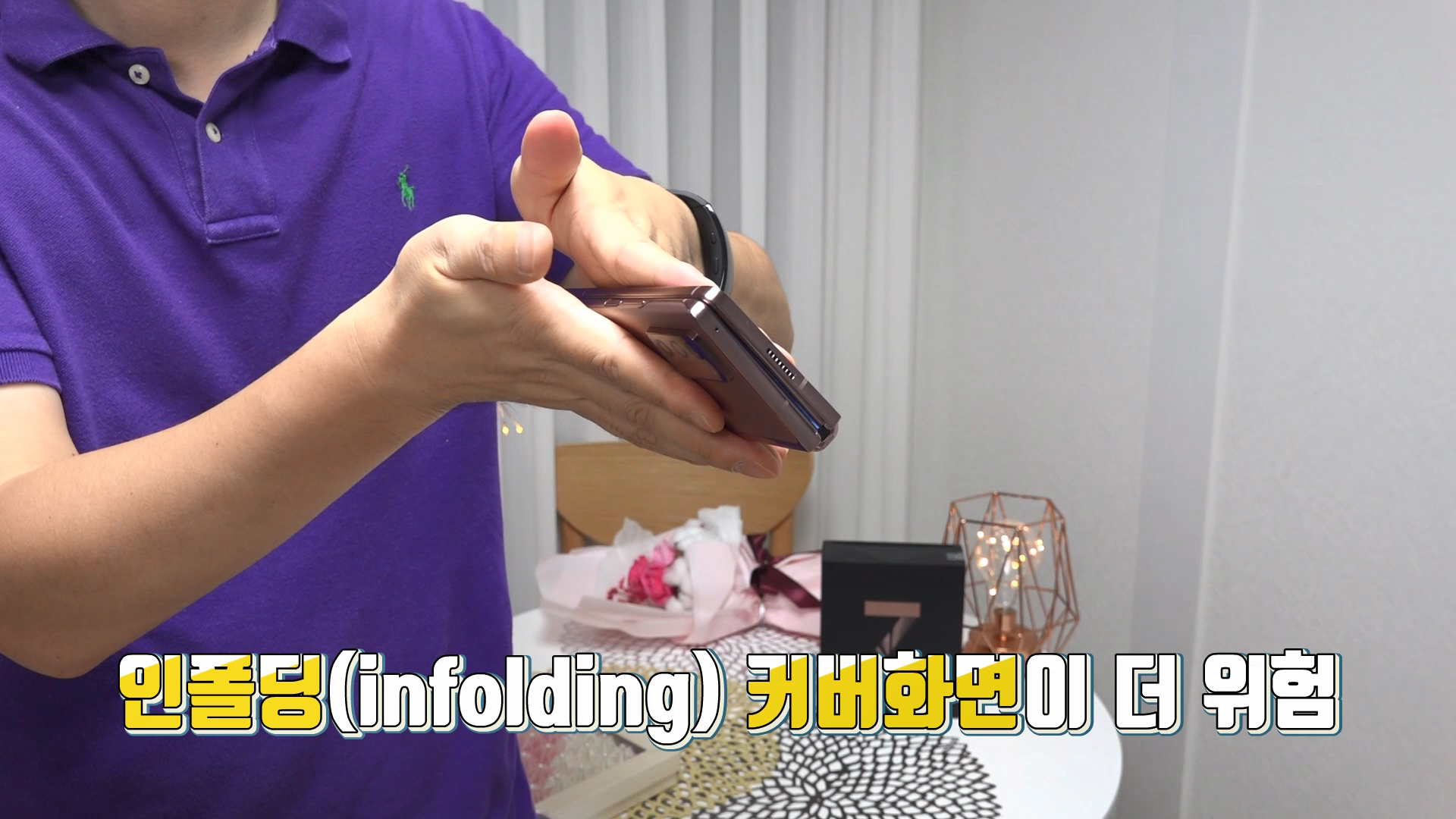 폴더블폰은 인폴딩과 아웃폴딩 방식으로 접는 게 되는 데, 갤럭시Z폴드2는 책처럼 접히는 인퐁딩(infolding) 입니다. 그렇기 때문에 오히려 커버 화면이 외부 충격에 파손될 수 있습니다.