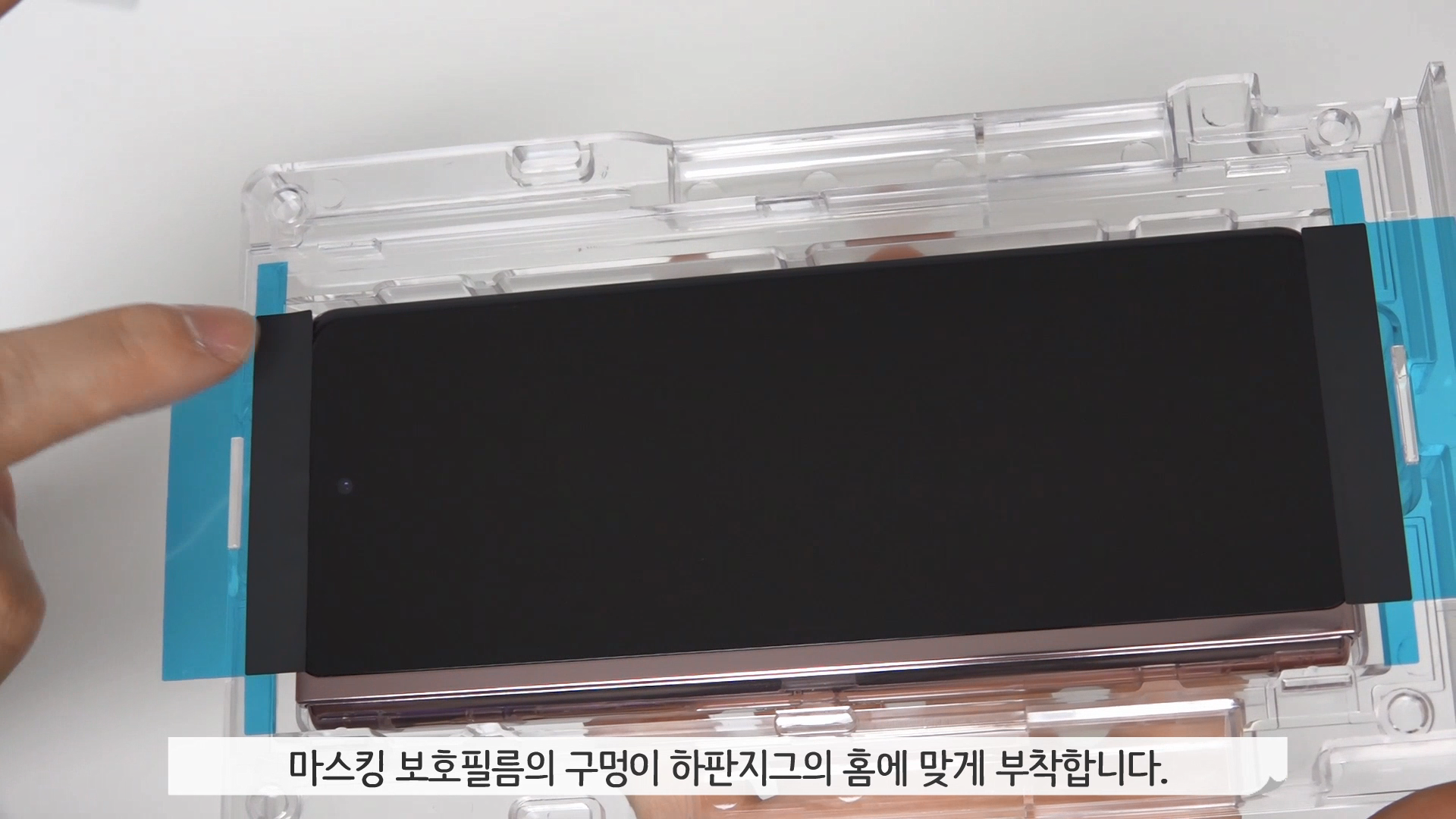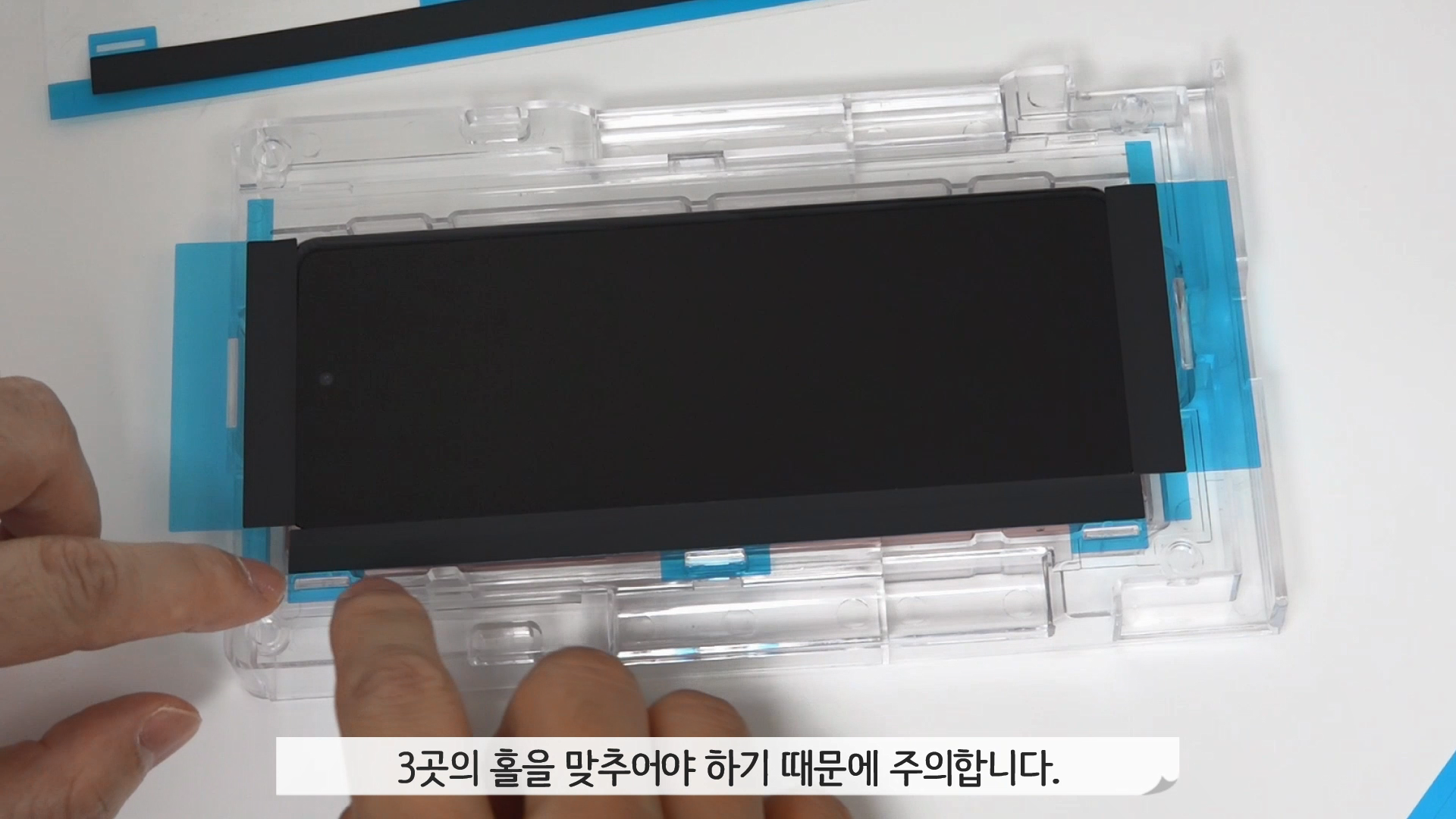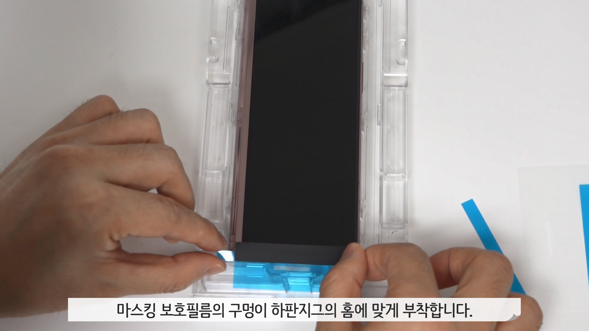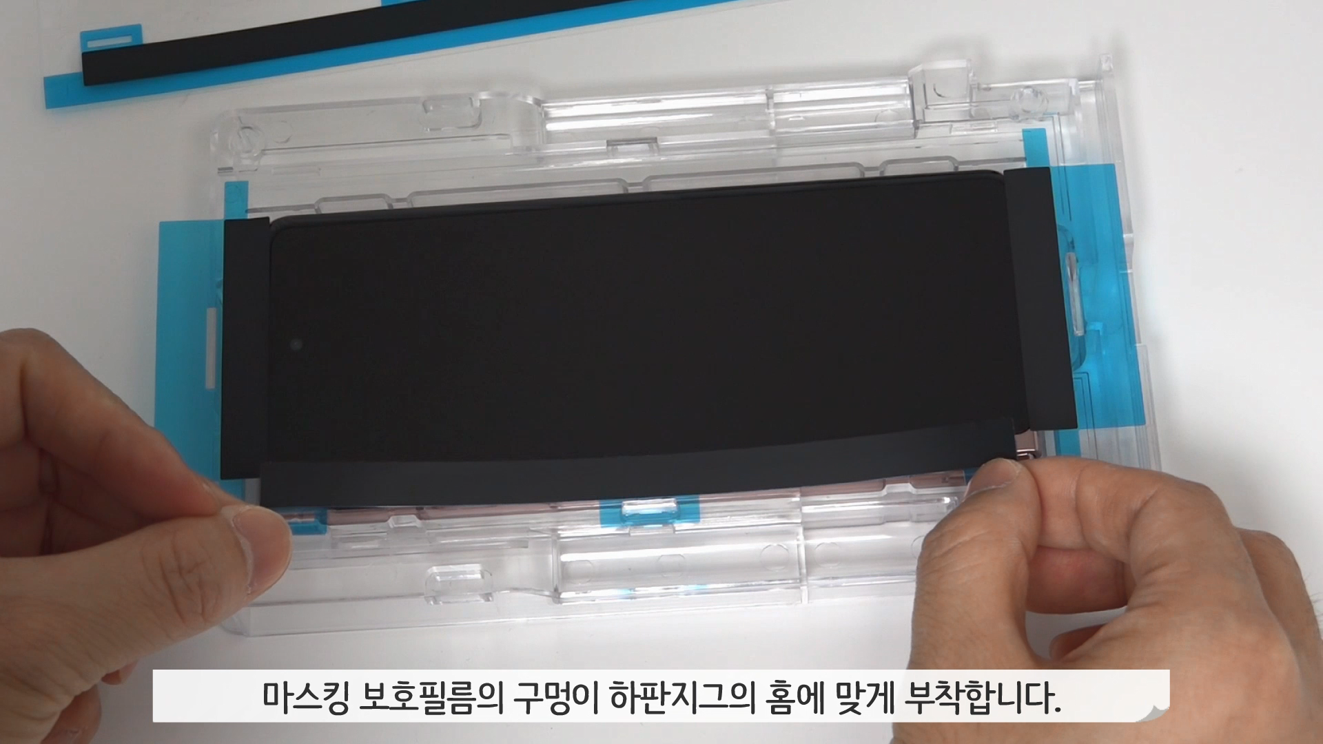 마스킹 필름의 구멍과 하판의 홈에 딱 맞추어 주면 간격을 잴 필요 없이 초보도 누구나 쉽게 잘 부착이 됩니다.