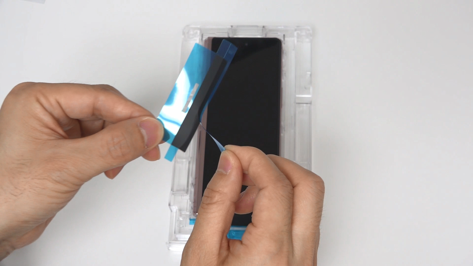 마스킹 필름이 송수화부에 붙이기 쉽게 홀이 있고 하판 지그의 홈과 맞추어 끼워주면 적당히 테이프가 덮이게 됩니다. 돔글라스는 프리미엄(고급) 셀프 부착 강화유리 패키지라 이런 부분이 잘되어 있습니다.