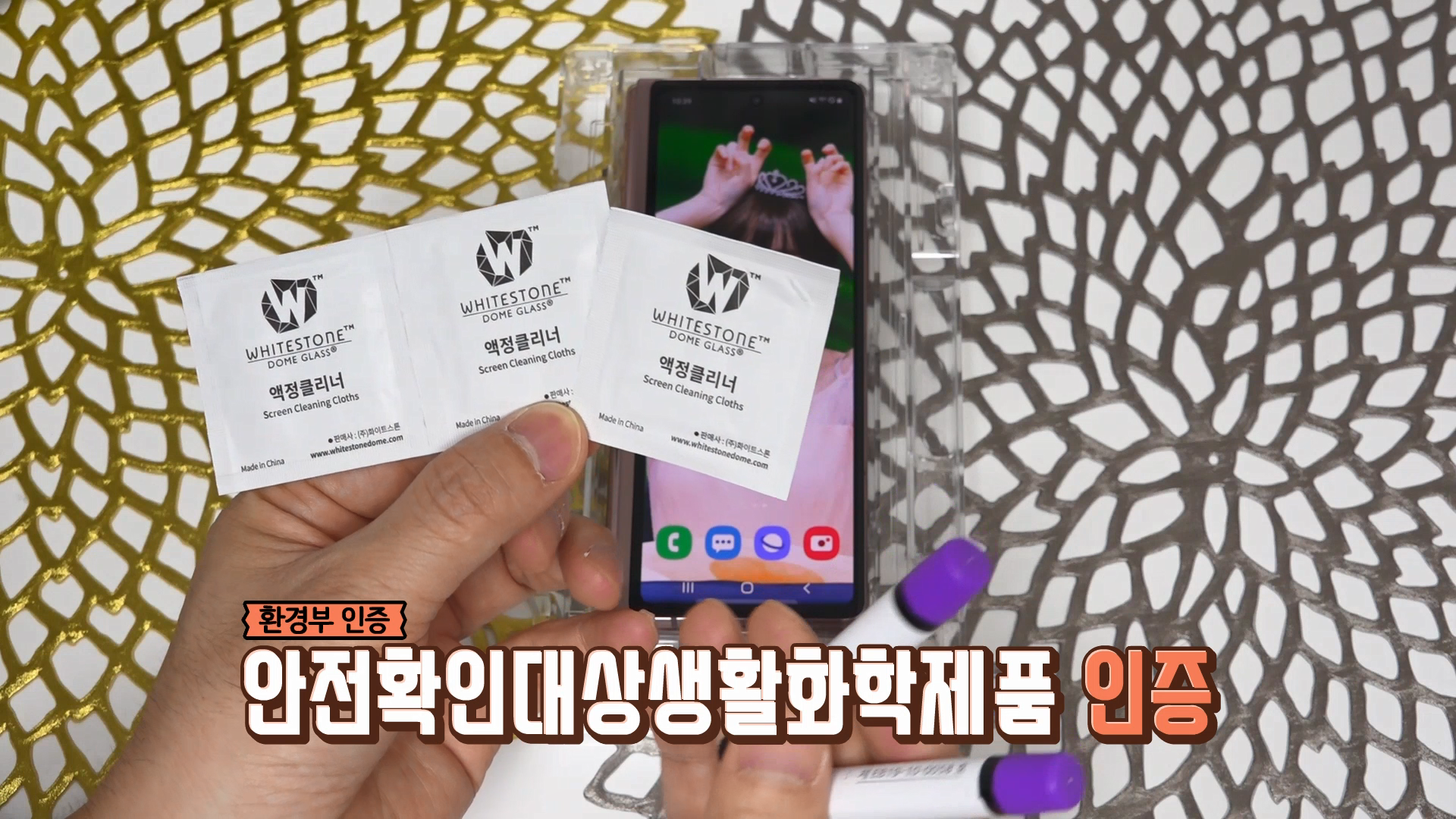 구성품에 액정 클리너(알코올 솜)와 점착액은 환경부로부터 인증을 받은 안전확인대상 생활화학제품입니다. 안전하지만 아이들의 손이 닿지 않는 곳에 두시는 것을 권해 드립니다.