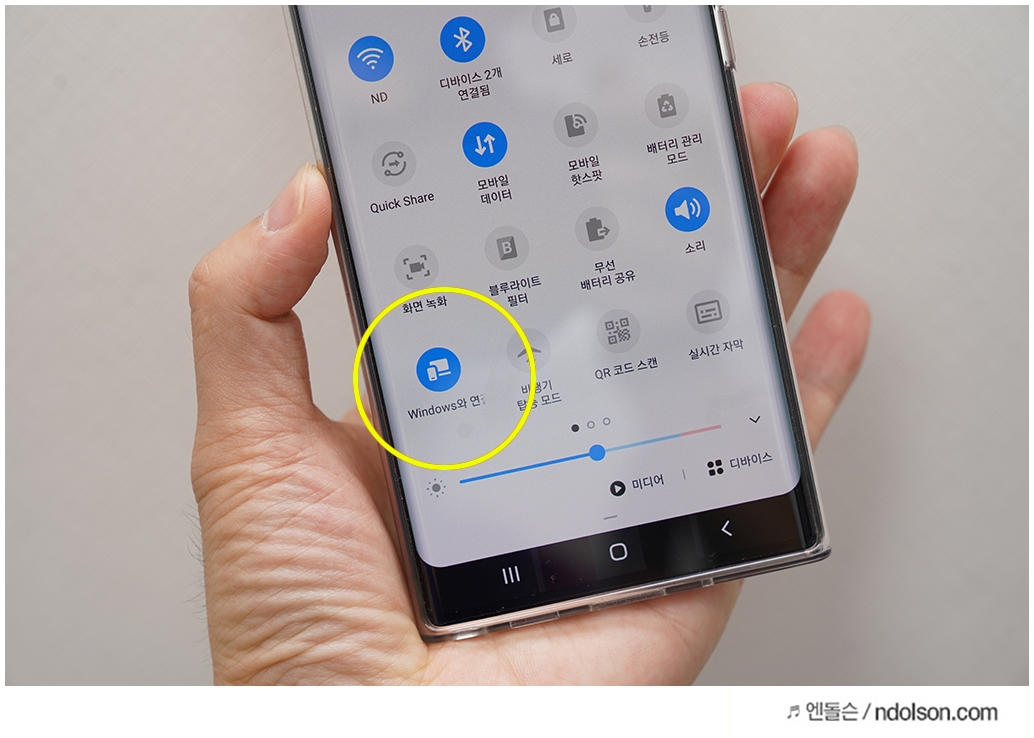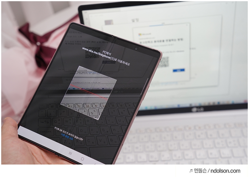 스마트폰에서 "Windows와 연결"을 눌러 켜줍니다. 스마트폰을 노트북 컴퓨터에 연결하기 위해 QR코드만 보여주면 됩니다. 무엇보다 무선인 상태로 제언된다는 게 좋습니다.