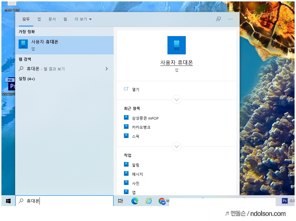 윈도우에서 "휴대폰"으로 검색하면, 사용자 휴대폰 앱이 나옵니다.