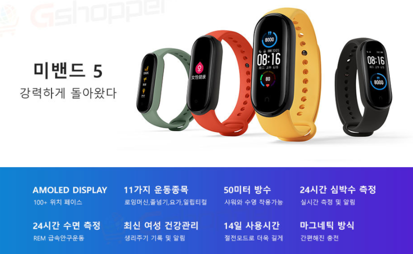 필자도 미밴드5를 써본 경험이 있어 가성비 스마트밴드 중 하나로 평가하고 싶은데요. 한글, 영문이 지원되는 글로벌롬으로 즐겨보세요.