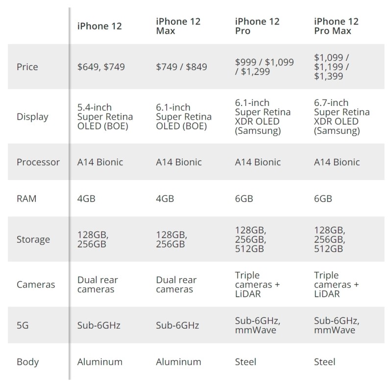 아이폰12 모델 : 아이폰12 미니(5.4인치), 아이폰12(6.1인치), 아이폰12 프로(6.1인치), 아이폰12 프로맥스(6.7인치)