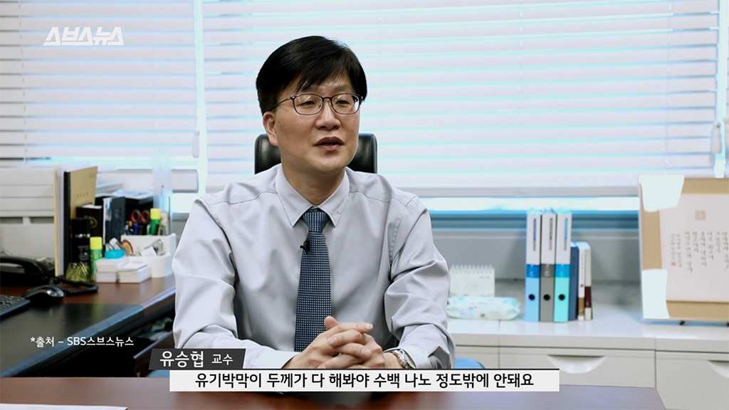 머리카락 굵기(평균 100㎛(=0.1mm))정도도 안 되는 두께에 축구장 크기의 막을 균일하게 형성했다고 보면 됩니다. 불가사의한 일 같은데요.