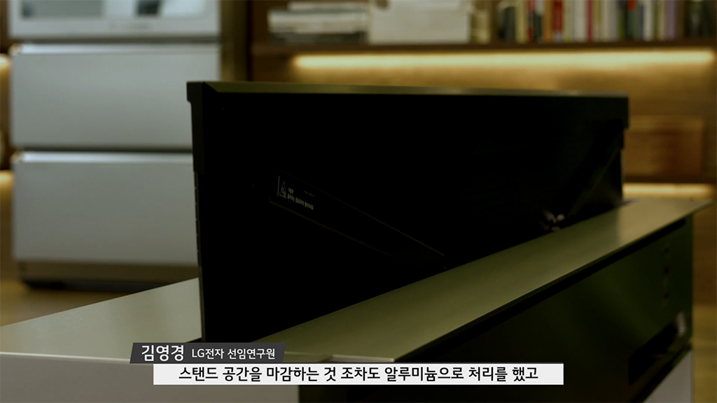 LG 시그니처 올레드 R 은 선처리를 위해 얇은 스탠드 안에 공간을 만들었고 스탠드 공간 마감까지 알루미늄 처리를 해서 더욱 아름다운 모습을 갖추게 되었습니다.
