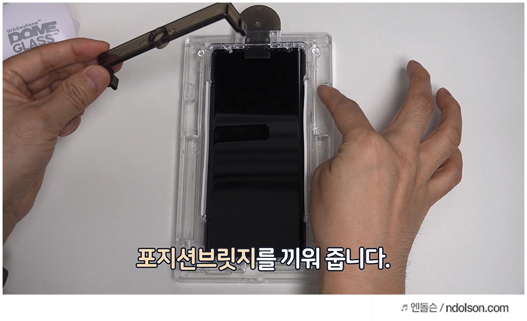 틀 위에 올려 두고 강화유리를 부착하면 됩니다. 스마트폰을 하단 틀에 올려둡니다.
