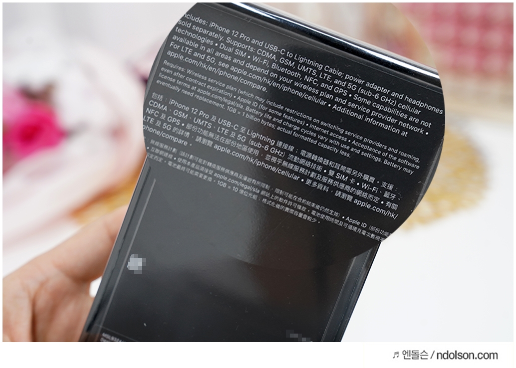 필자가 구매한 제품은 아이폰12 프로 128GB 제품이며, 홍콩 직구로 구매하여 듀얼 유심이 지원되는 모델입니다. 후면에 보면, 5G 지원과 서브로 6GHz LTE 지원에 대한 이야기와 제품 스펙 정보가 있습니다.