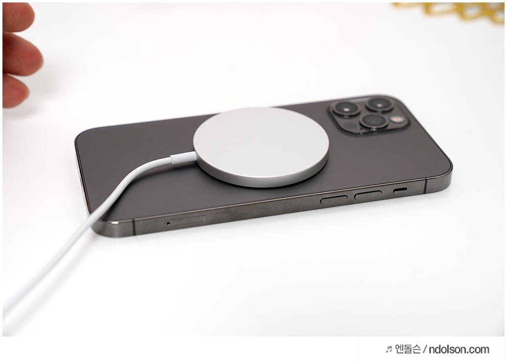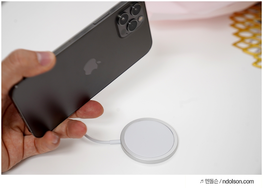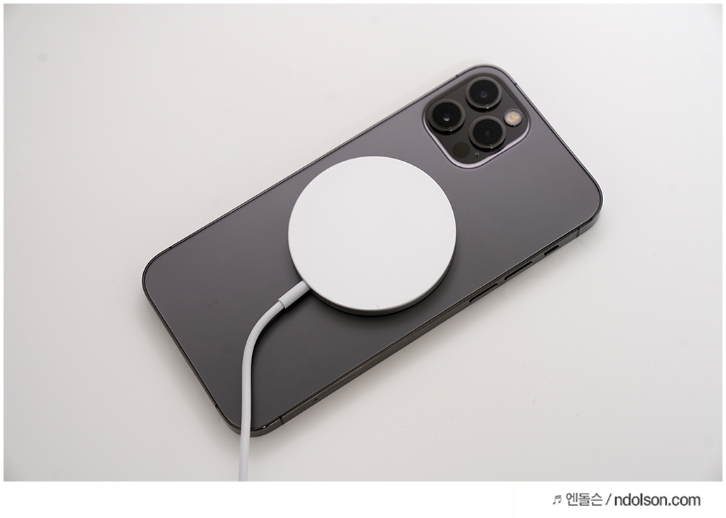 좋은 점이라면 아이폰12 시리즈에는 자석이 탑재되어 있어 맥세이프로 충전이 용이하다는 것입니다. 적절한 자석감으로 붙이고 땔 수 있습니다.