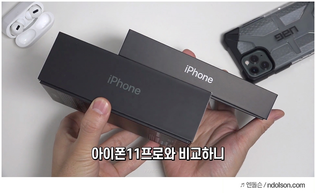 아이폰11 프로와 아이폰12 프로의 패키지를 비교해보면, 두께의 차이가 납니다. 아이폰12 구성품에는 어답터가 빠져 패키지 두께도 얇아졌습니다.