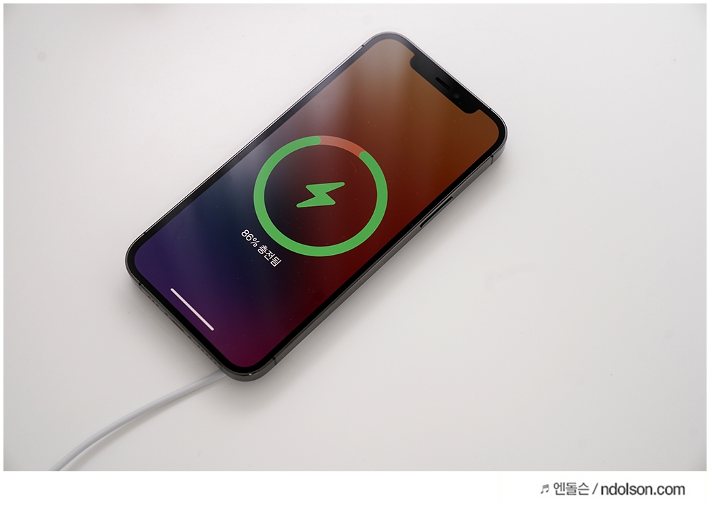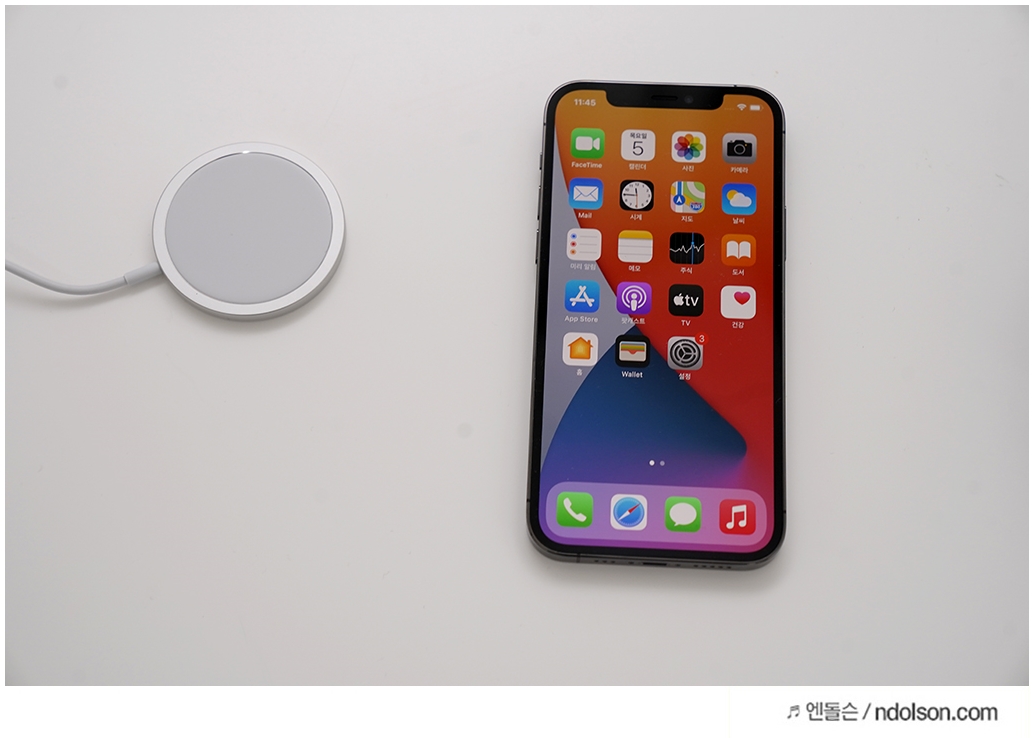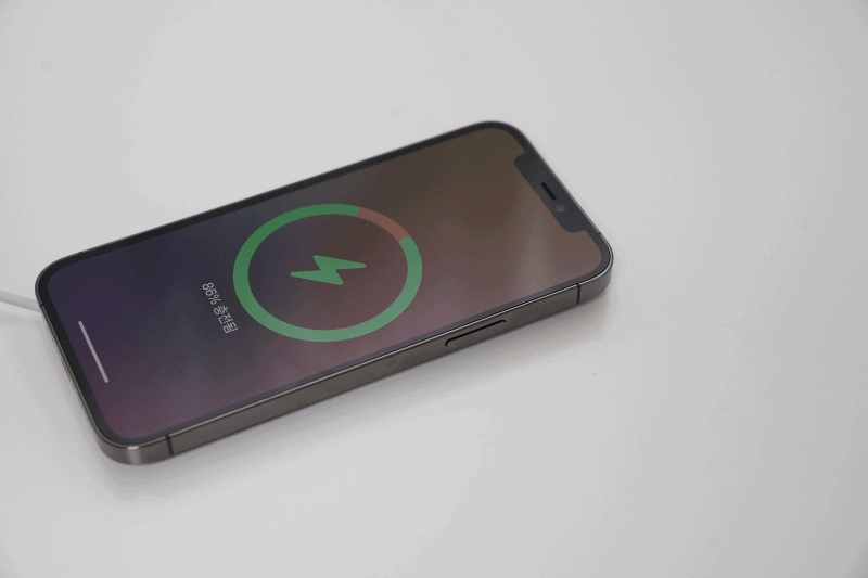 살짝 가져가면 알아서 착~하고 붙고 아이폰12 프로가 무선 충전이 됩니다. 맥세이프(MagSafe)는 15W 무선충전이 가능합니다. 혹시나 해서 아이폰11 프로도 충전해보니 가능하지만, 10W 이하로 충전됩니다. 아이폰11 맥세이프 사용보다는 아이폰12 이상부터 사용하는 게 좋습니다.