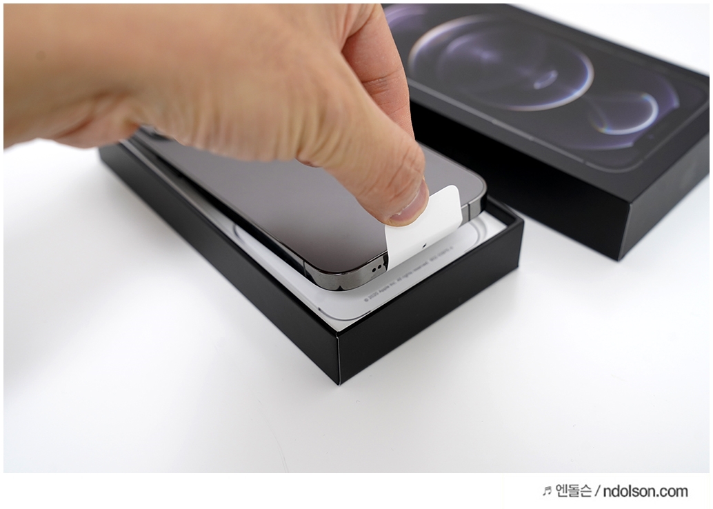 살짝 들어서 아이폰12 프로를 꺼내보았습니다. 종이로 되어 있는 데, 이전에는 비닐로 기억하는 데 바뀌었습니다.