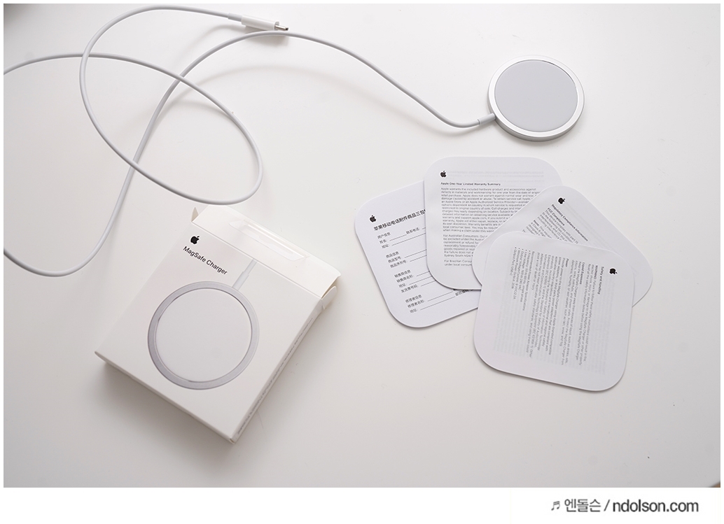아이폰12 맥세이프의 설명서와 제품이 들어져 있습니다. 작석타입으로 붙여 15W 무선충전이 가능합니다.