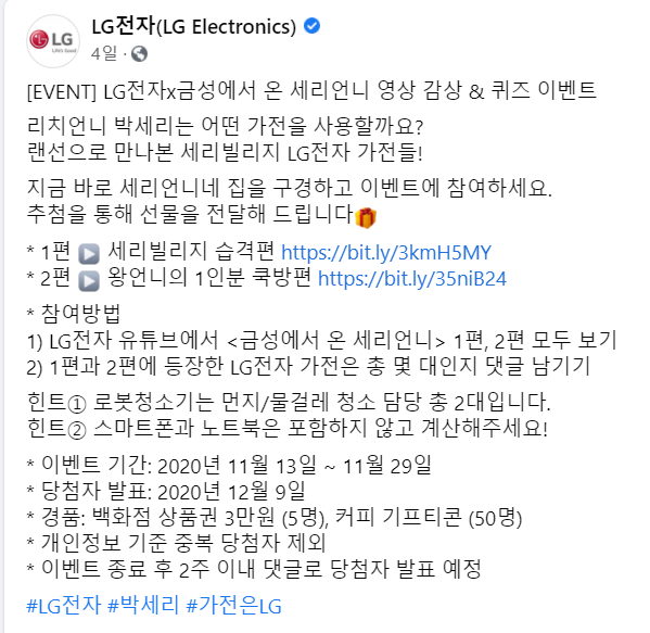 박세리의 재미난 입담과 리치 언니의 라이프 스타일을 보는 재미가 있네요. LG가전이 많이 등장하는데, LG전자 페이스북에서 퀴즈 이벤트도 진행하고 있으니 맞추어 보세요~