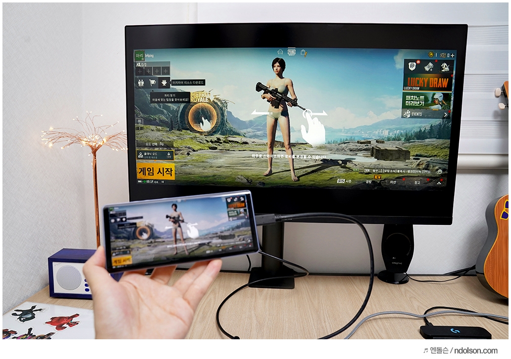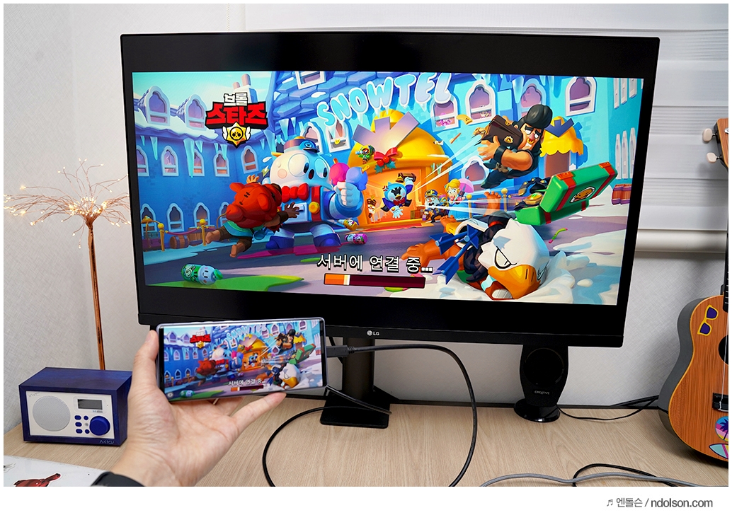 또 데이터 연동도 가능해서 스마트폰 화면이 바로 미러링 되어 그대로 보입니다. 스마트폰의 게임 및 앱 실행하는 화면이 바로 모니터로 출력됩니다.