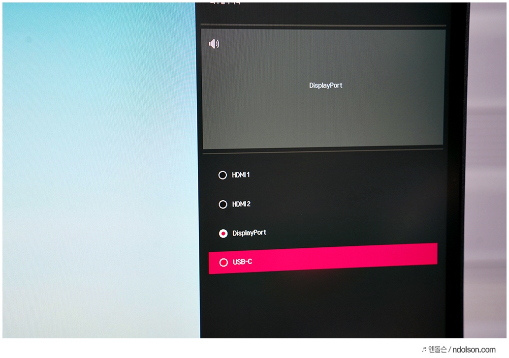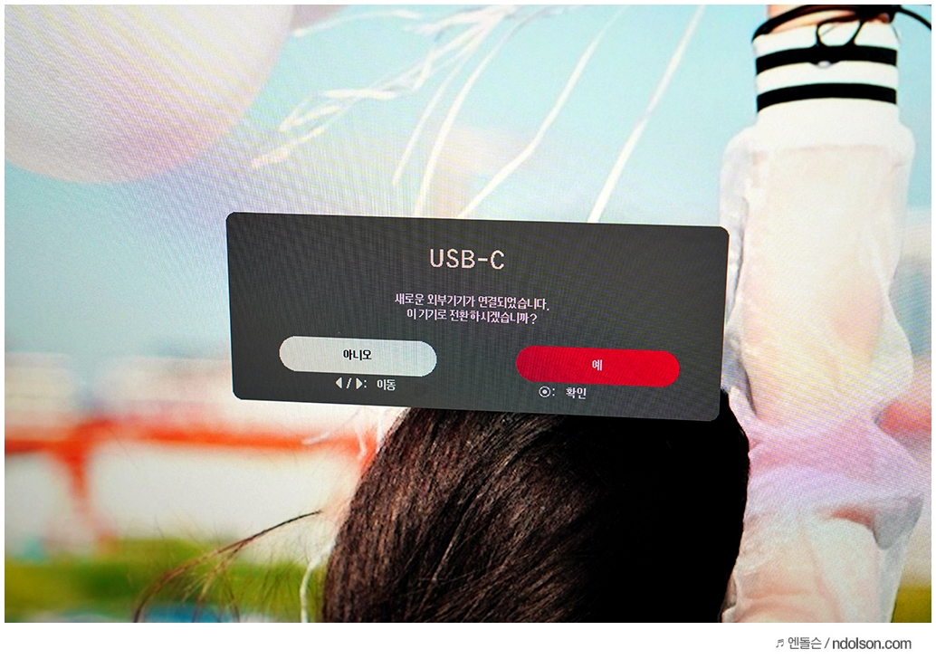 노트북이나 스마트폰에 연결하면 모니터의 USB-C 단자에 새로운 외부기기가 연결되었다고 뜹니다. 또는 입력에서 외부 입력 장치를 변경해서 모니터 USB-C로 연결할 수 있습니다.