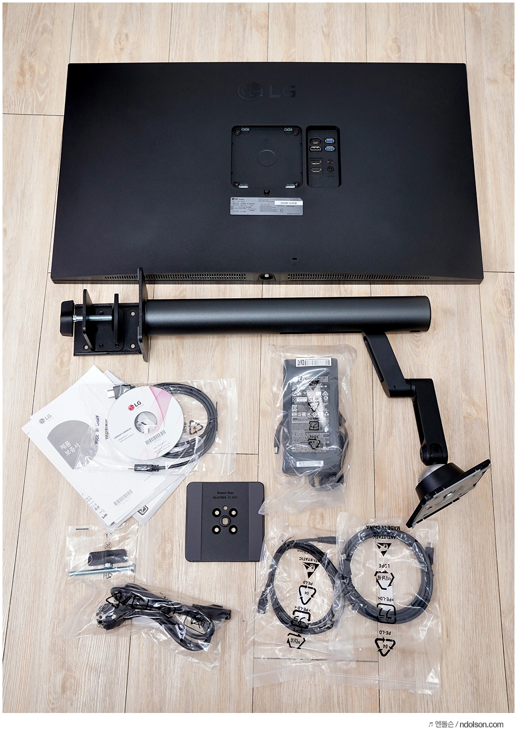 자유도가 높은 3세대 스탠드가 적용된 LG 울트라 HD 모니터의 구성품입니다. 책상에 따라 타공 또는 거치로 설치할 수 있는 다양한 부속품과 USB-C to C 케이블 및 HDMI, DP 케이블, 어답터를 제공합니다.