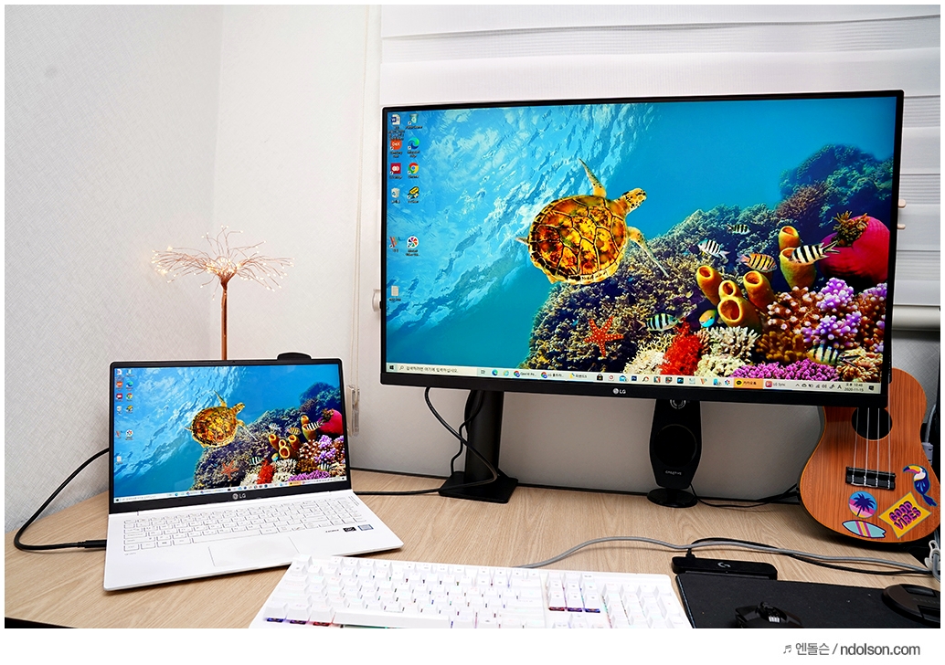 USB-C 단자는 60W 를 지원해서 노트북 및 스마트폰 충전도 가능하며 데이터 전송도 가능합니다. LG 그램 노트북과 모니터 USB-C 단자를 연결하면 바로 듀얼 모니터로 연결되어 화면이 공유됩니다.