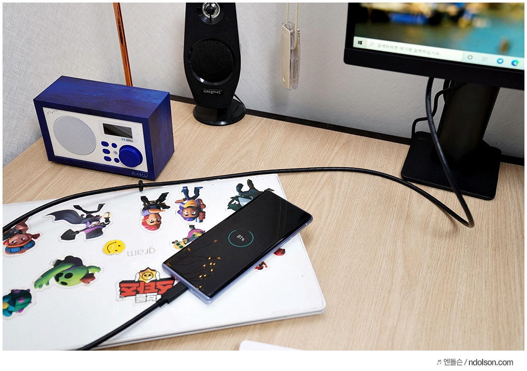 모니터의 USB-C 단자로 노트북과 스마트폰을 60W로 쉽게 충전할 수 있다는 장점이 있습니다. 책상 위에 별도의 충전기가 필요 없기 때문에 공간을 더욱 깔끔하게 정리할 수 있다는 장점이 있습니다.