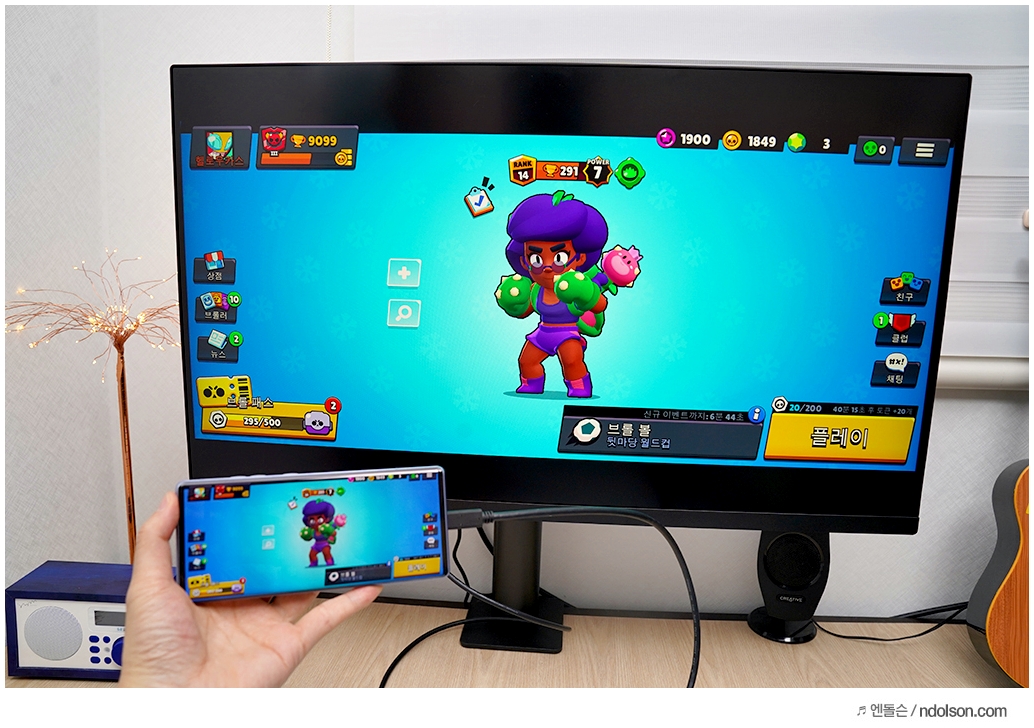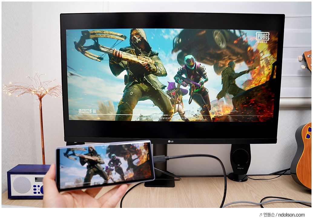 또 데이터 연동도 가능해서 스마트폰 화면이 바로 미러링 되어 그대로 보입니다. 스마트폰의 게임 및 앱 실행하는 화면이 바로 모니터로 출력됩니다.