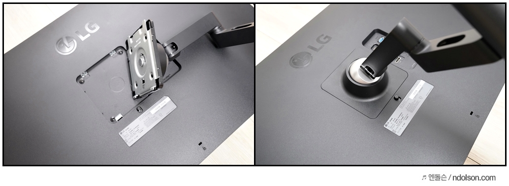 여러 모니터를 설치해 보았지만, LG 모니터가 가장 설치가 쉽습니다. 먼저 책상에 스탠드를 설치한 뒤 모니터를 올리면 되는데, 나사/드라이버 필요 없이 원클릭으로 연결하는 방식으로 되어 있습니다.