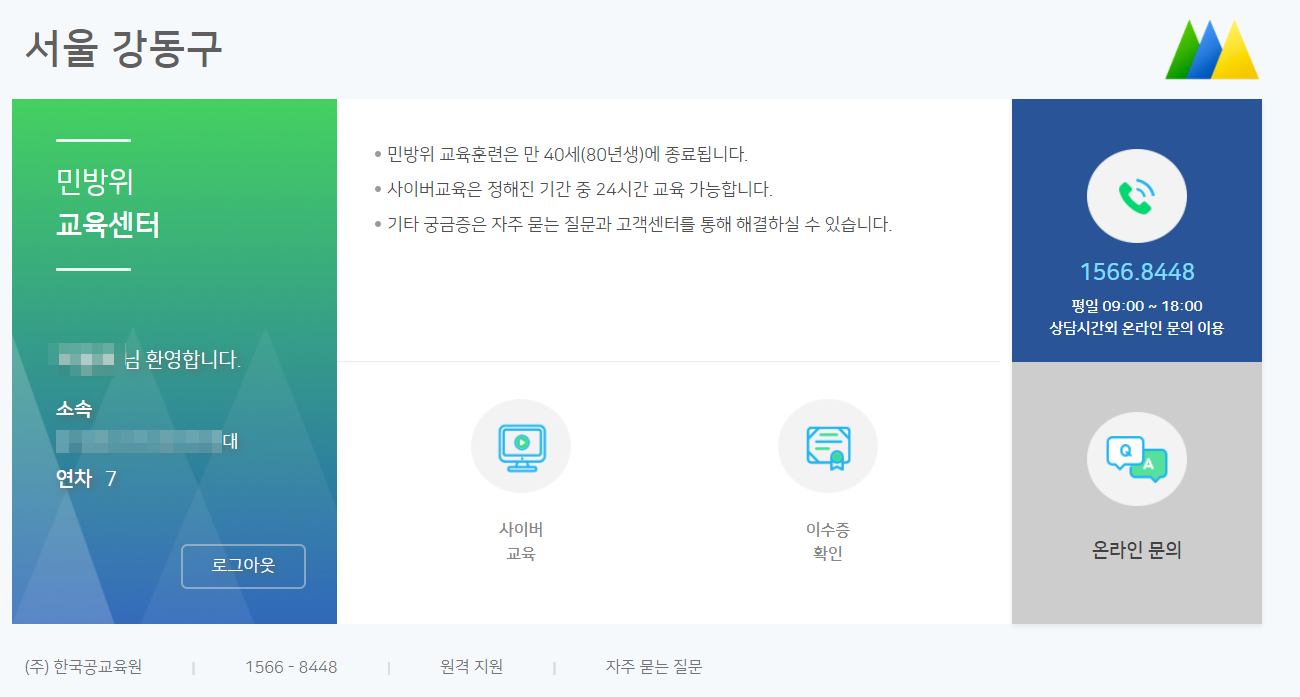 민방위 사이버 교육 홈페이지 : www.cmes.or.kr/gghanam/login
