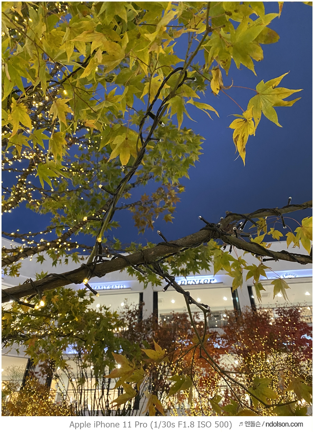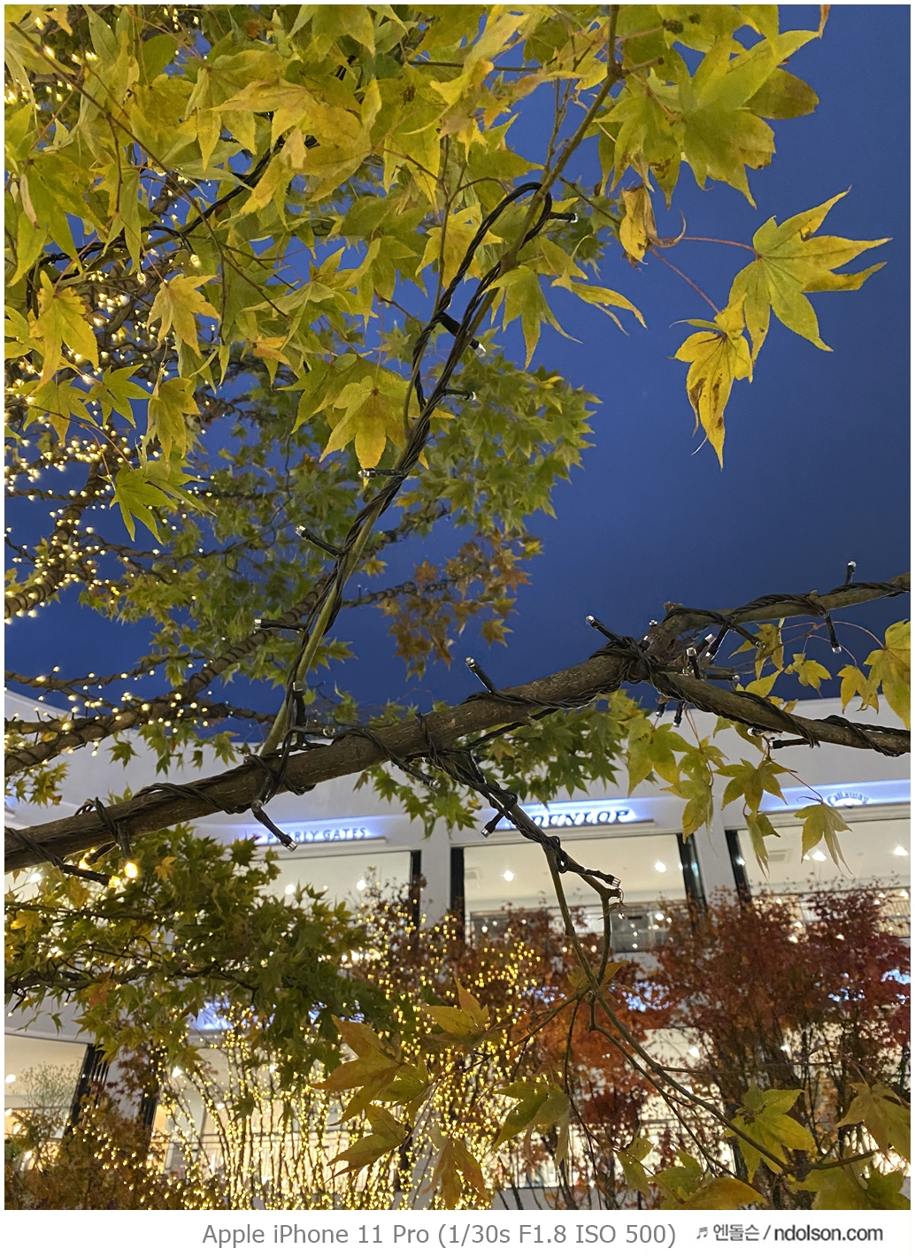 아이폰12 프로는 F1.6 이고 아이폰11 프로는 F1.8로 조리개 값의 차이가 있는 것을 알 수 있습니다. 야간에 야외 건물을 촬영할 때 아이폰12 프로가 나머지 세팅값을 떠나서 더 밝은 사진을 찍어 줍니다.