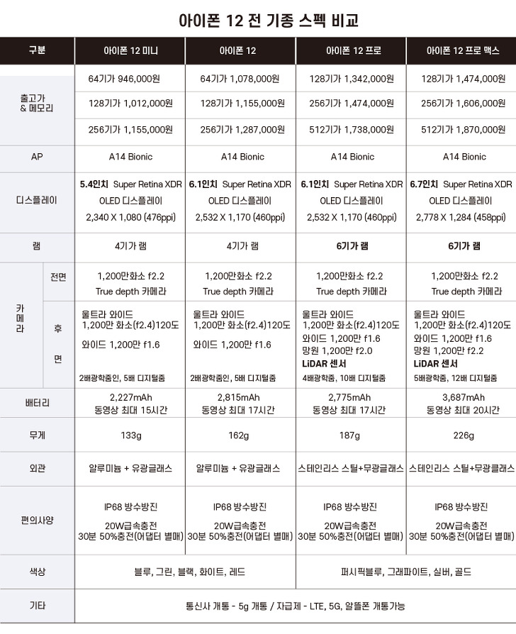 아이폰12 프로 스펙을 보시면, 아이폰12 보급형 기종과 프리미엄 기종의 차이를 눈여겨볼 수 있습니다. 아이폰12 프로 이상부터 라이다(LiDAR 센서)가 탑재되었습니다.