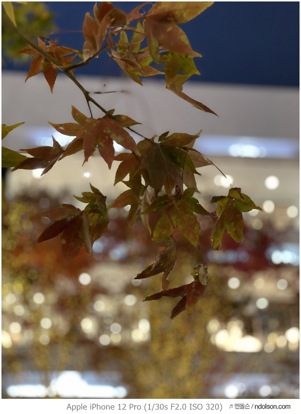 F값이 1.6 인 아이폰12 프로와 달리 갤럭시노트20 울트라는 F값 1.8 인 것을 봐도 스펙상에 아이폰12 프로가 조금 더 우위에 있는 카메라 렌즈라는 것을 알 수 있습니다. 상대적으로 더 적은 빛으로 충분히 좋은 사진을 뽑을 수 있어 ISO를 많이 높이지 않아도 노이즈가 적은 사진을 뽑을 수 있는 것이죠.