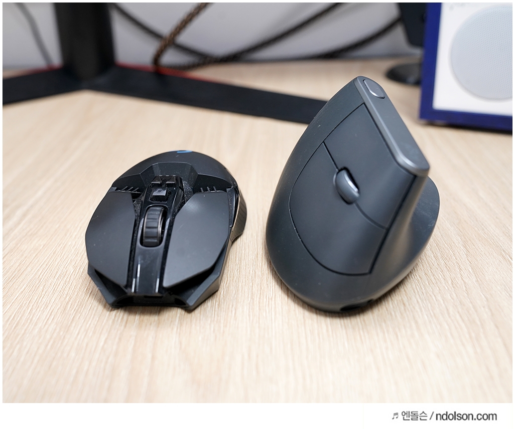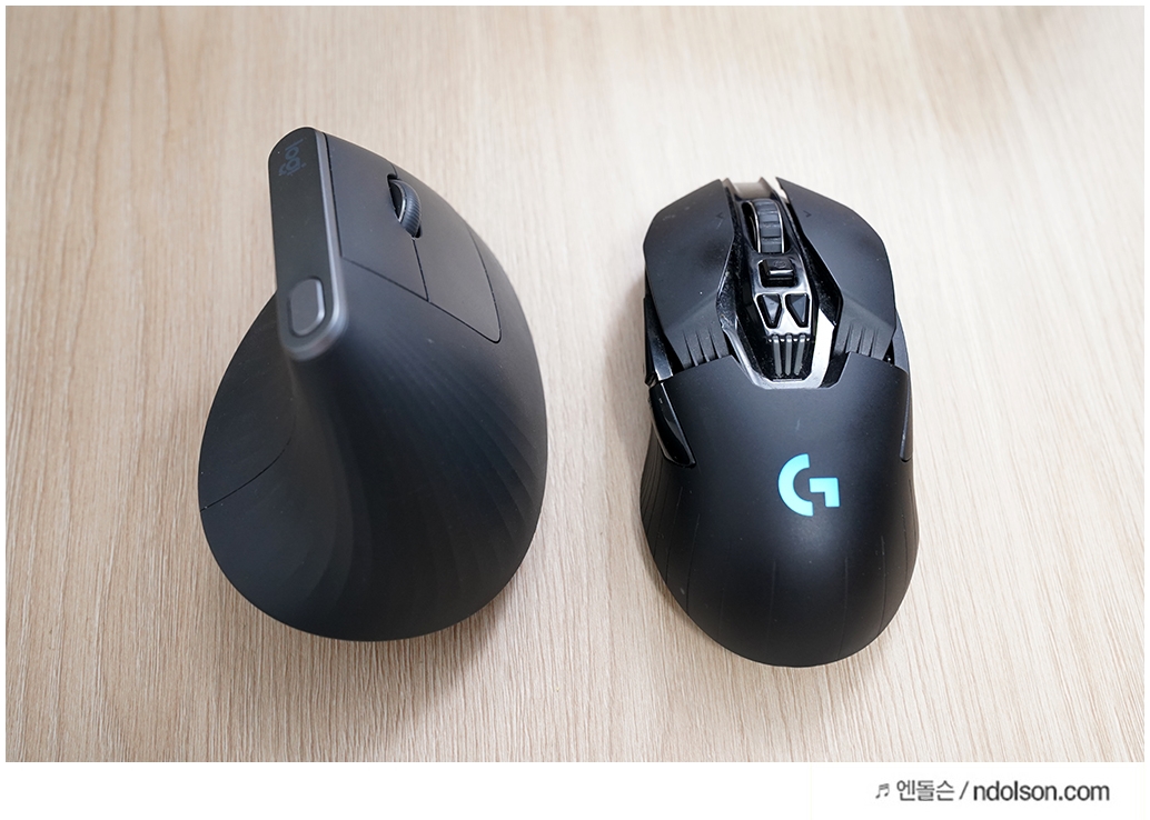 기존 사용하던 로지텍 G903 게이밍 무선 마우스와 비교하여 보았습니다. 게이밍에 특화된 제품이지만, 로지텍 MX vertical이 더욱 손목의 부하를 줄이기 위해서는 좋습니다.